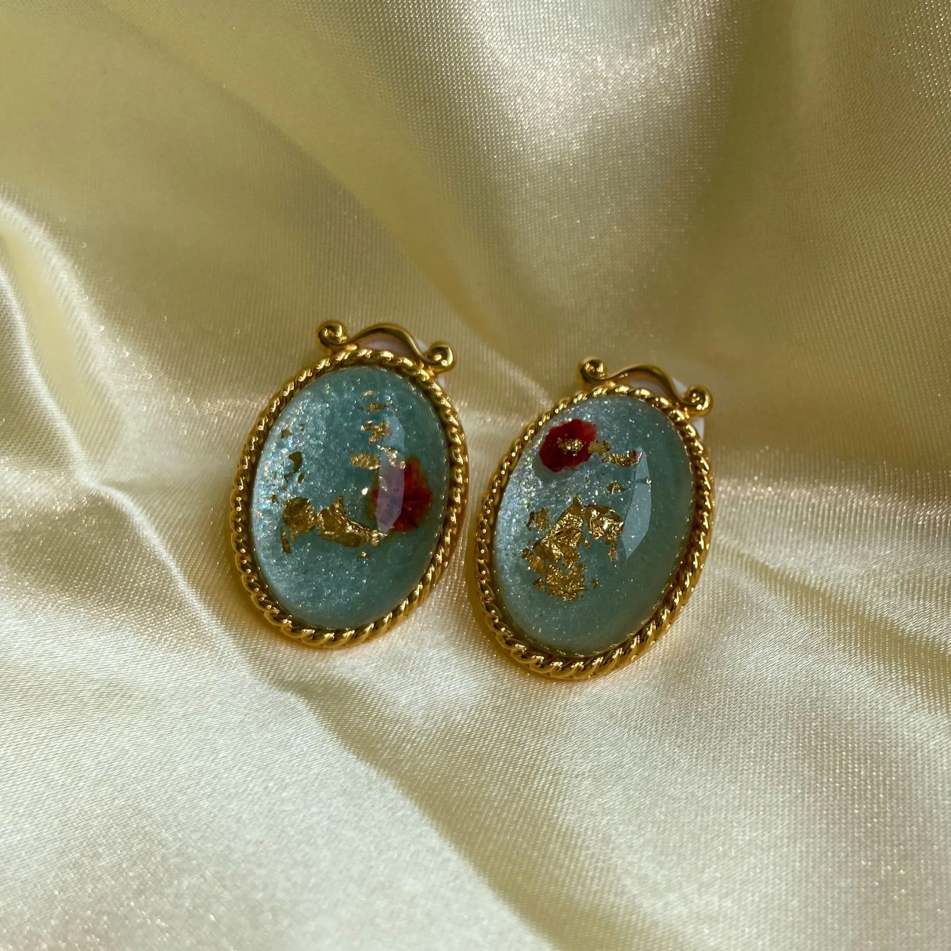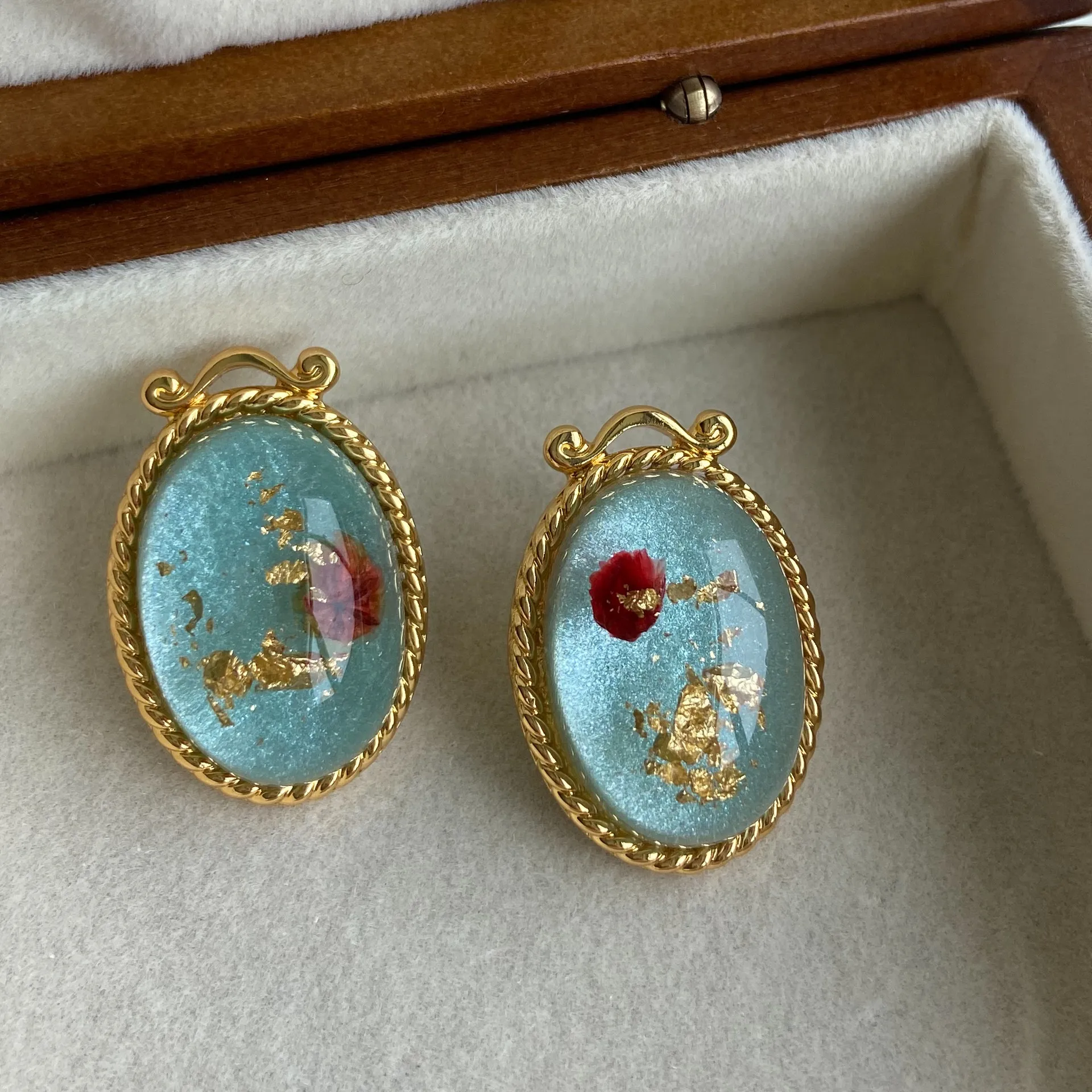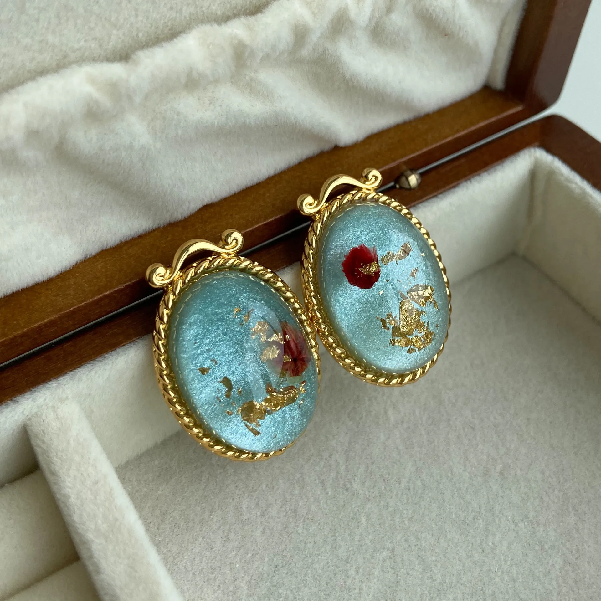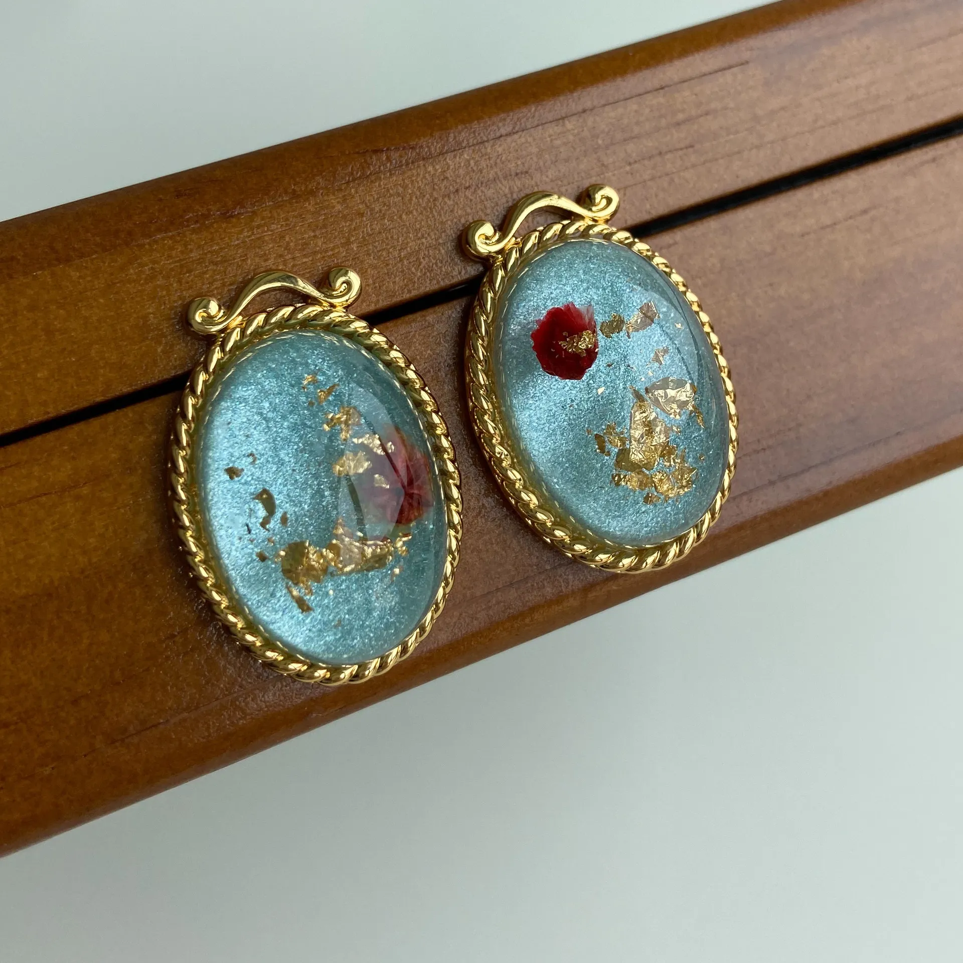Material: copper plating 18k gold, epoxy dried flowers