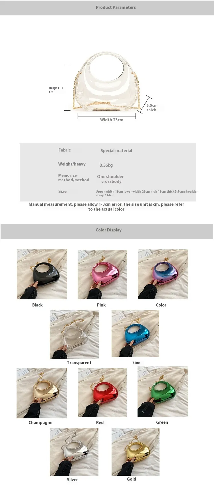 Not only does this handbag offer functionality, but it also serves as a striking accessory that enhances your overall look. Whether paired with a little black dress or your favorite jeans and a top, the Acrylic Small Size Gold Handbag adds a modern twist to any ensemble. Its lightweight construction makes it easy to carry, ensuring you can stay stylish without feeling weighed down.
