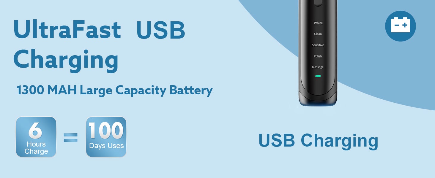- 120 Days Battery Life - Rechargeable electronic toothbrush lasts up to 120 days on a 2.5-hour charge. The sonic toothbrush features a low battery indicator that flashes red when it is low and ultra-fast USB charging. The included USB-C cable (adapter not included) replaces the bulky charging base, so you don't have to worry about losing your charging cable and is compatible with any other USB-C cable you may have at home.