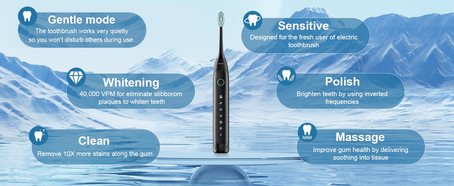 - 5 High-PERFORMANCE MODES- Sonic electric toothbrush has 5 modes. Clean: For daily cleaning; Sensitive: Softer cleaning for sensitive; Whitening: Remove surface stains; Polishing: 1-minute whitening teeth; Massage: For gum care. To accommodate different teeth and gum conditions for different cleaning and care needs.