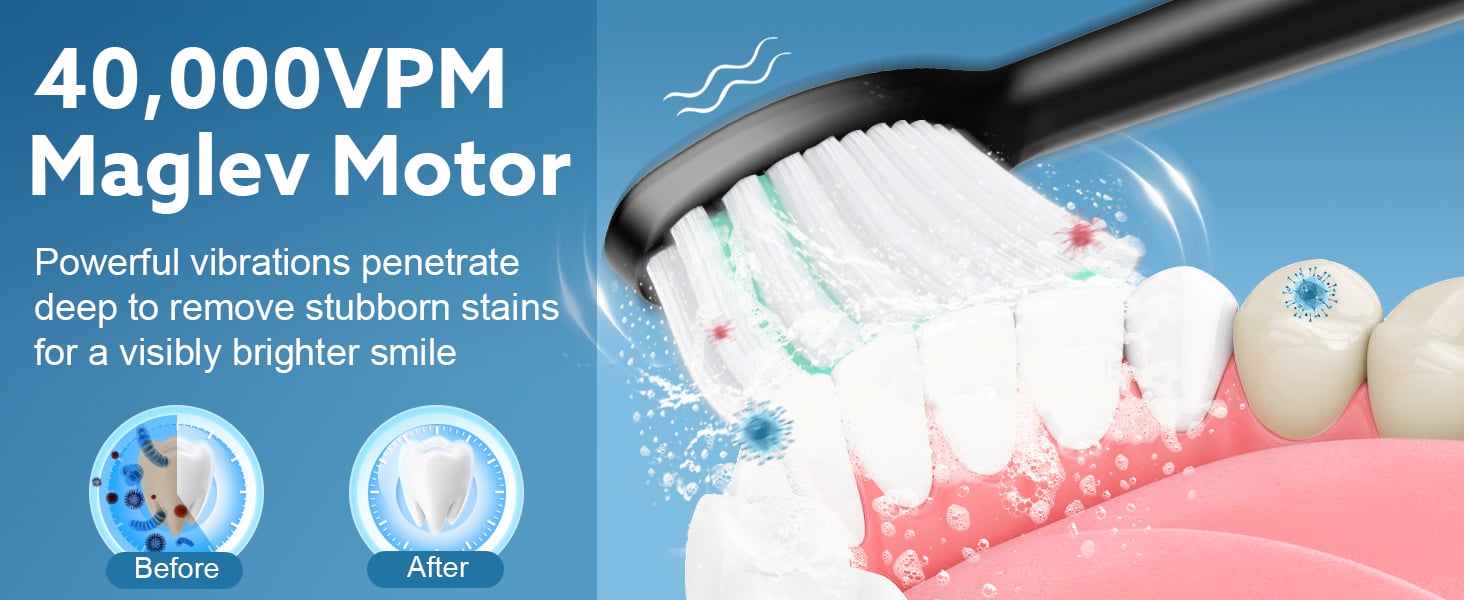 - Superior Clean and Healthier Gums - Up to 40,000 VPM high vibration sonic toothbrush. Remove up to 99.99% of plaque and stains for a deep clean along the gumline and between the teeth. With soft flexible sides, the bristles contour to the shape of each tooth's surface to provide 4x more surface contact and remove up to 10x more plaque from hard-to-reach areas for a deep clean.