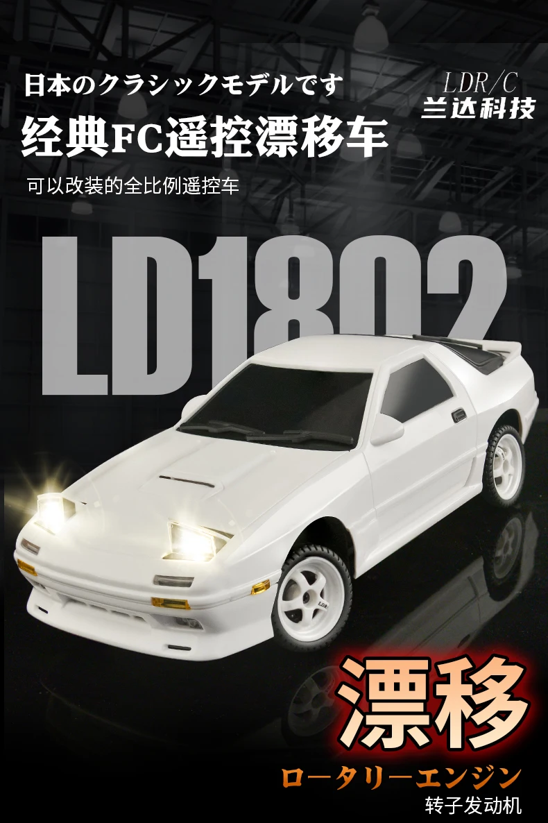 This 1:18 scale AE86 Model RX-7 FC RC drift car features a 2.4G remote control, ESP gyroscope, and LED lights. Designed for on-road drifting, it offers precise control and thrilling performance, making it an exciting mini RC racing car toy for enthusiasts and kids.AE86 RX-7 FC Model LD1801 LD1802 RC Car 1/18 2.4GRemote Control AWD On Road 15Km/H ESP Gyroscope LED Light RC Drift Racing Toy Car Gift for Boy