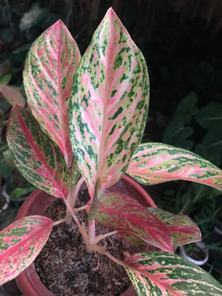 Aglaonema 'Pink Butterfly' features broad, lance-shaped leaves with a striking combination of pink, green, and cream variegation. The leaves have a central pink or red midrib and are adorned with a mix of green and cream hues, creating a beautiful contrast. The leaves are glossy and smooth, adding to the plant's overall visual appeal. The vibrant colors make this plant a standout addition to any indoor plant collection.