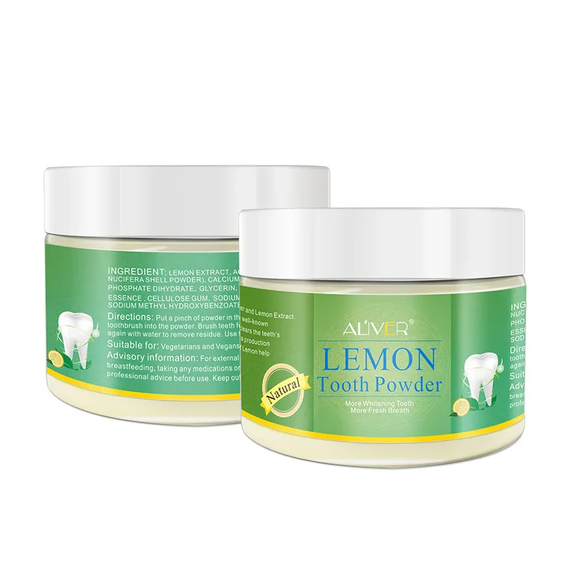 ALIVER lemon tooth powder, natural whitening tooth powder, lemon teeth brightening powder, fresh breath tooth powder, stain removal tooth powder, cosmetic dental powder, at home whitening powder, powder toothpaste alternative