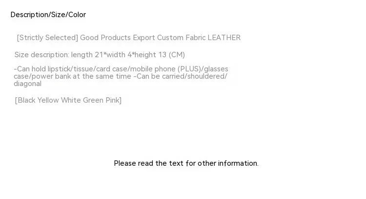 DescriptionMaterialLeatherProduct AttributesOrdinaryPackage Size230*60*150(1mm)