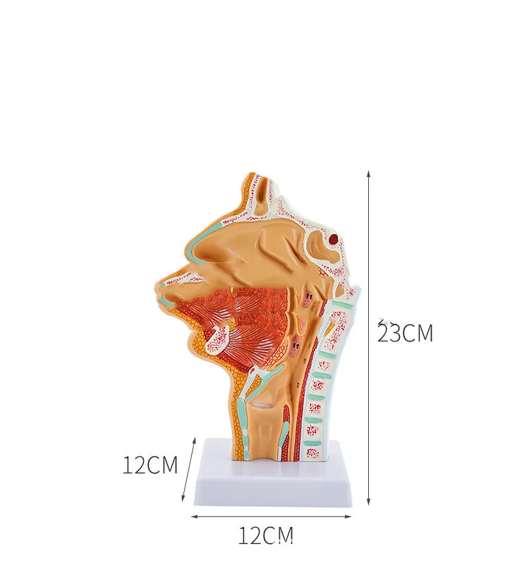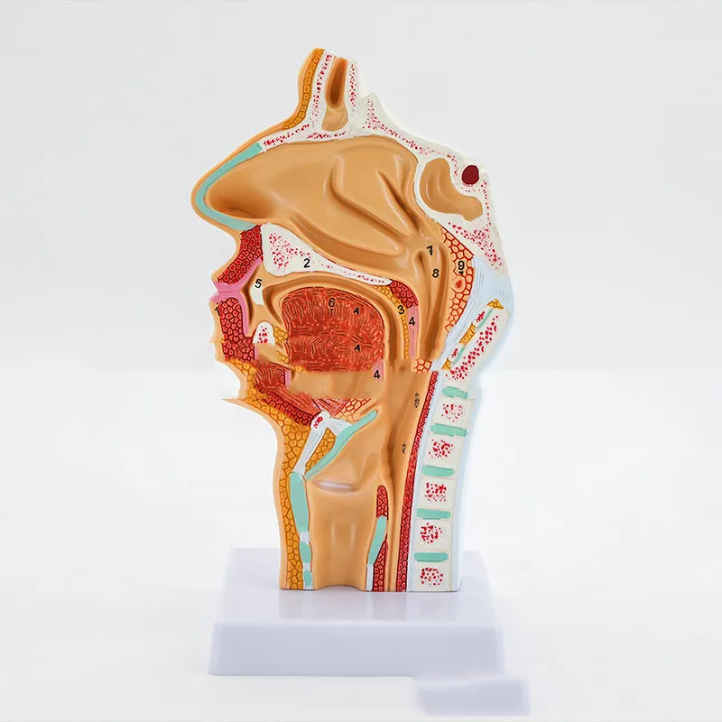 The model includes a cross-sectional design that allows users to see each layer of the nasal, oral, and throat regions, showing the spatial relationships between these areas. The layered view helps illustrate how air and food pathways are divided and how different anatomical structures, such as the soft palate and epiglottis, control these functions. This layout is beneficial for understanding disorders related to the throat and respiratory pathways.