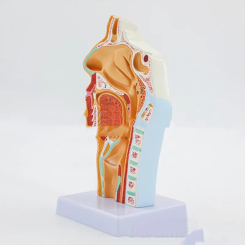 The model includes a cross-sectional design that allows users to see each layer of the nasal, oral, and throat regions, showing the spatial relationships between these areas. The layered view helps illustrate how air and food pathways are divided and how different anatomical structures, such as the soft palate and epiglottis, control these functions. This layout is beneficial for understanding disorders related to the throat and respiratory pathways.