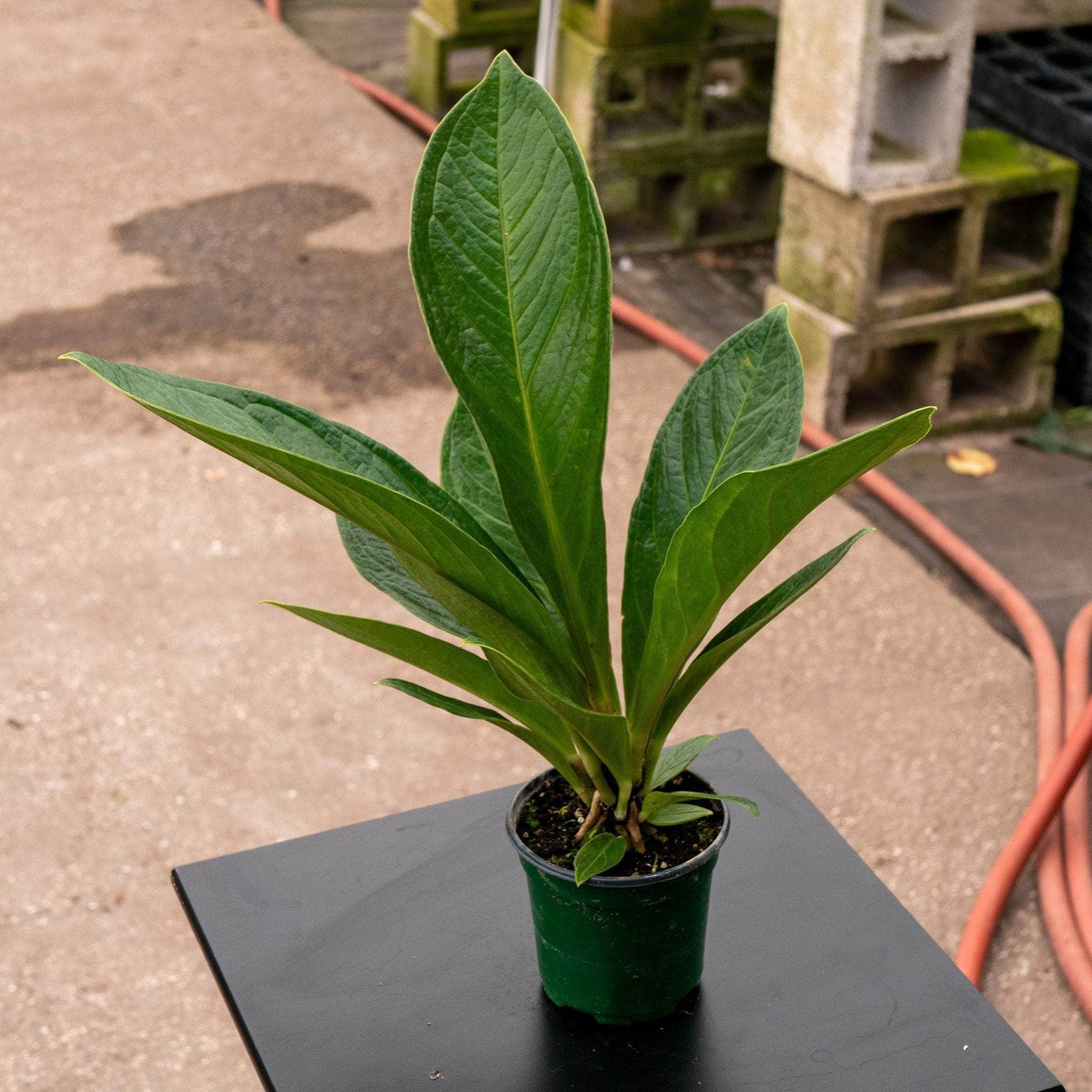 Anthurium 'Cobra' boasts elongated, lance-shaped leaves that emerge in a rich, vibrant green and mature to a deep, glossy green. The leaves are thick and leathery, with prominent veins that add texture and depth to their appearance. The plant’s upright growth habit gives it a distinctive, sculptural look, making it a striking focal point in any space. As the plant matures, it develops a rosette of leaves that fan out, resembling the hood of a cobra, hence its intriguing name.