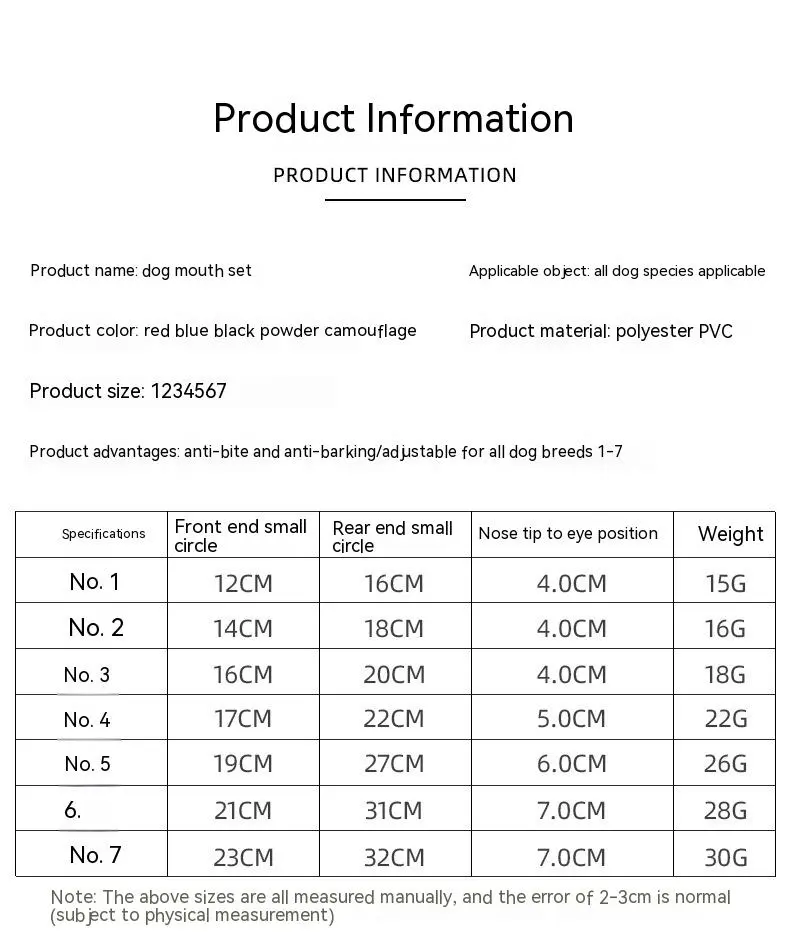 The Anti-bite Anti-miseating Dog Mouth Cover Waterproof Bark Stopper is a must-have tool for pet owners seeking to control unwanted behaviors such as biting, chewing, and excessive barking. With its humane, waterproof design, and adjustable fit, this device provides a safe and effective way to train your dog and promote good behavior. Whether you're managing destructive chewing habits, preventing harmful eating, or curbing nuisance barking, this mouth cover offers a versatile solution for all your pet training needs.