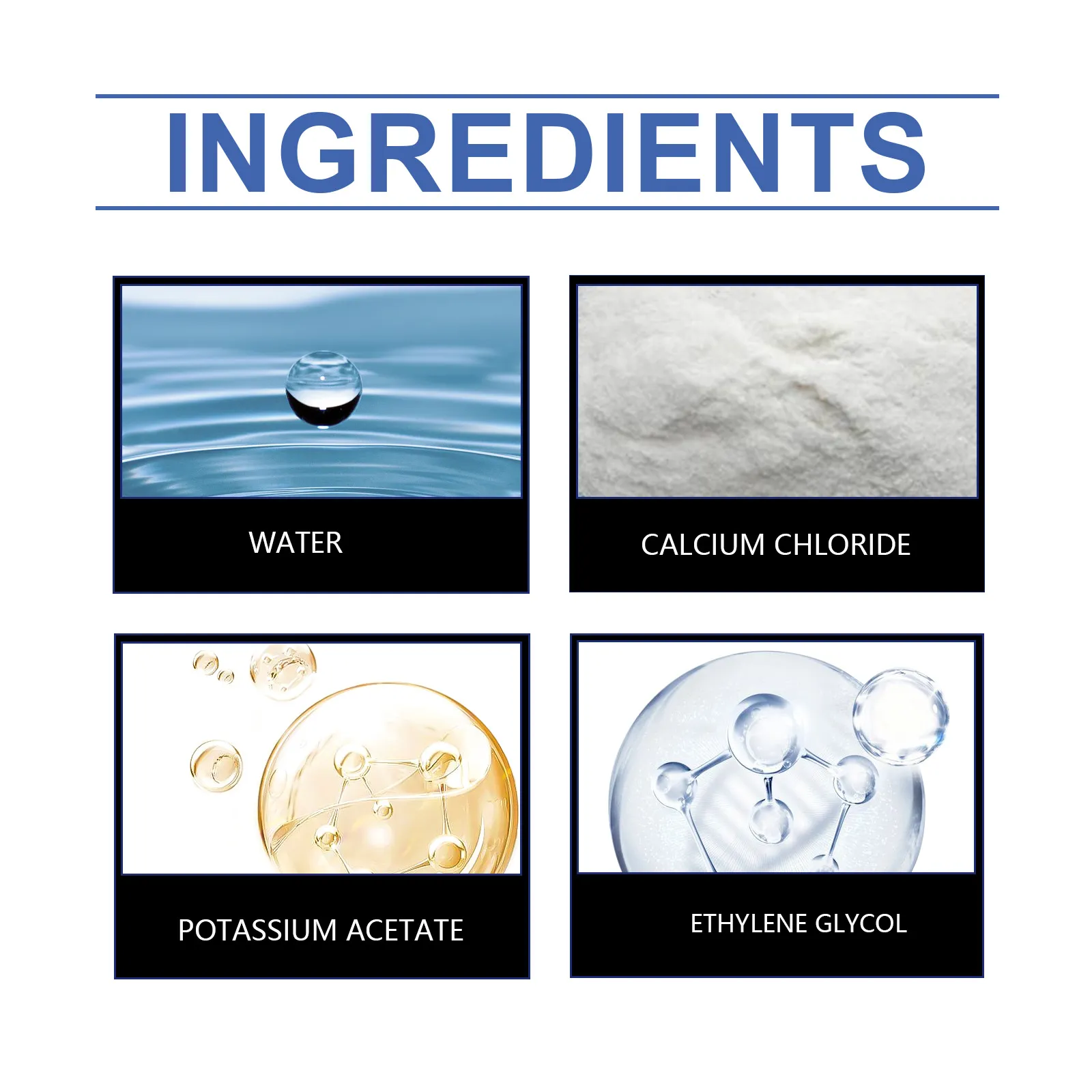 Product ingredients: water, calcium chloride, potassium acetate, ethylene glycol