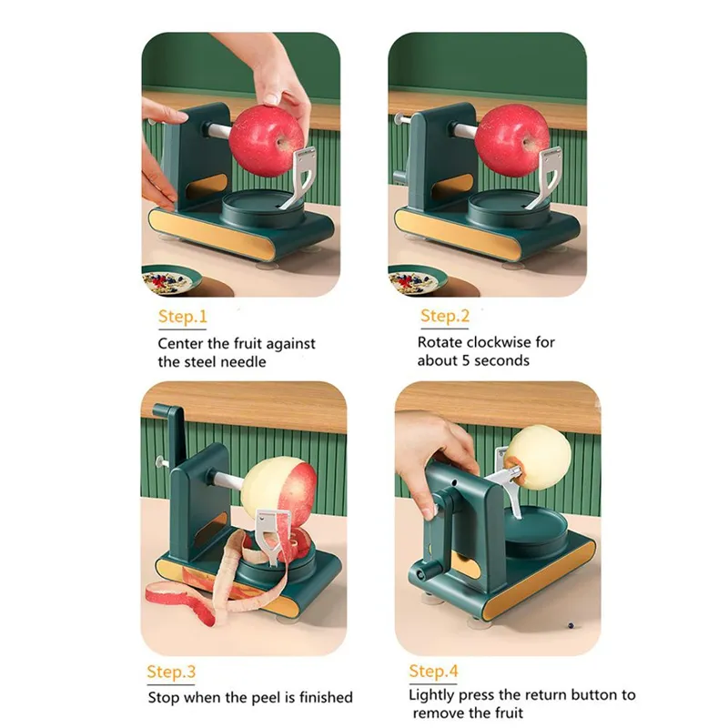 Constructed with durable materials — typically food‑grade stainless steel blades and a sturdy base — the device is engineered to handle frequent use. It features a secure mounting system (suction base, clamp, or weighted platform), a sharp peeling blade that removes skin efficiently, a coring blade that extracts the core cleanly, and a slicing mechanism that produces uniform rings or spirals. As you rotate the ergonomic handle, the fruit moves precisely through each processing stage, delivering ready‑to‑use pieces for cooking, baking, or serving.