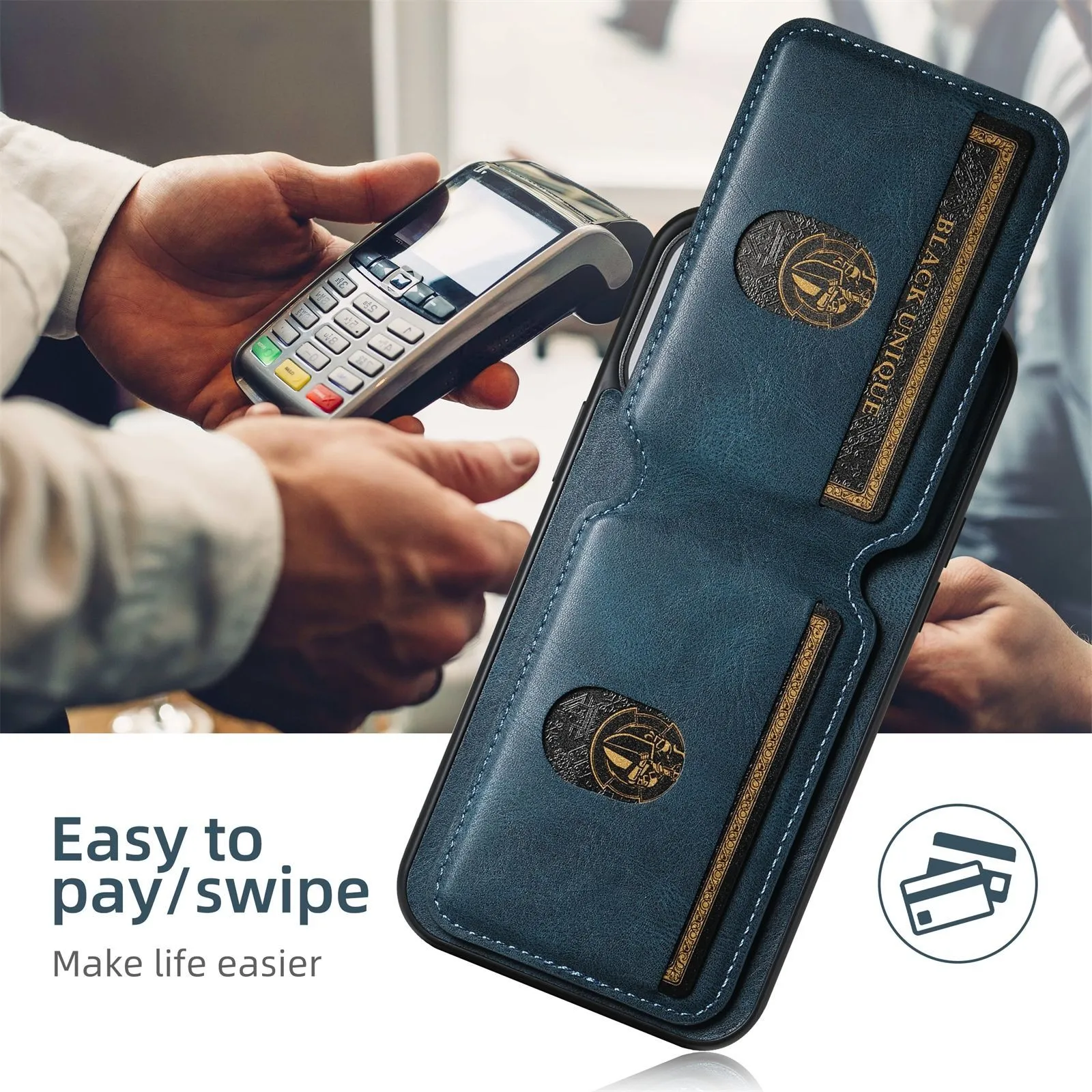 Crafted from high-quality PU leather, this case protects your phone from scratches, bumps, and everyday wear while maintaining a slim profile. The card slots are secure yet easy to access, letting you carry IDs, credit cards, or transport cards without needing a separate wallet. Its lightweight design ensures comfort and portability.
