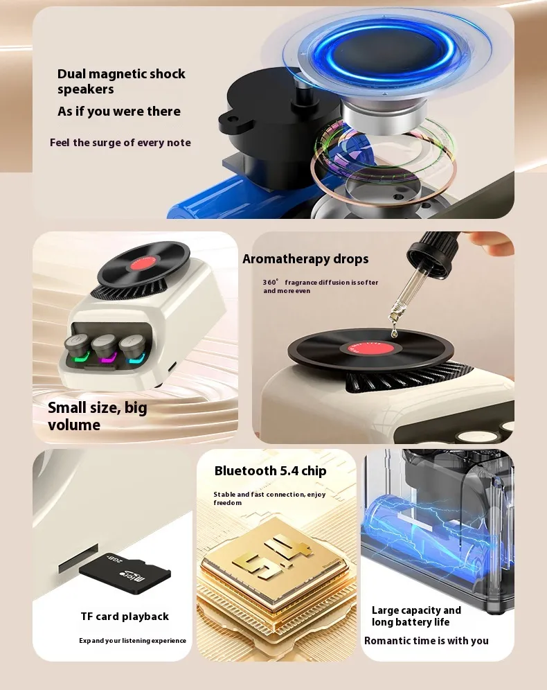 The Aromatherapy Bluetooth Speaker Mini Retro CD Ambience Light is a compact yet powerful device that integrates several features to enrich your environment: