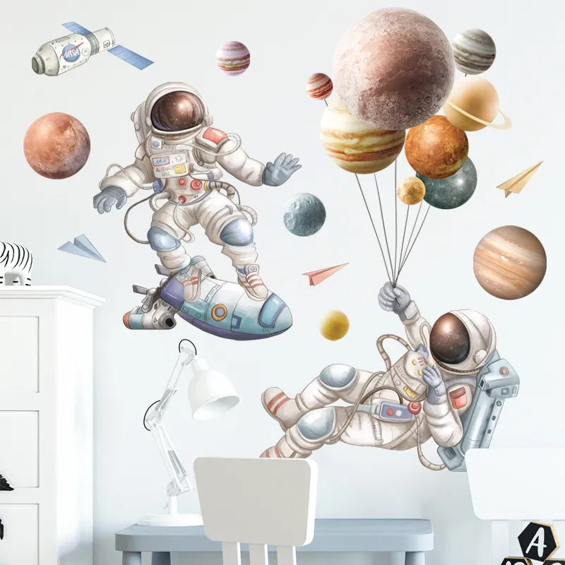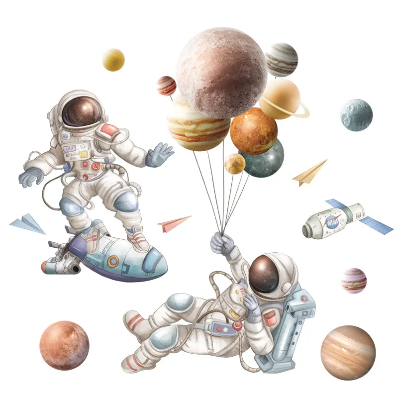 - Includes 3D astronaut decals, planetary views, rockets, and floating satellites.