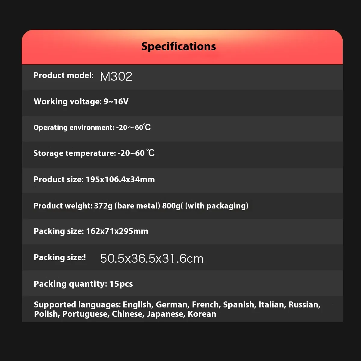 Specification: M302 handheld reader