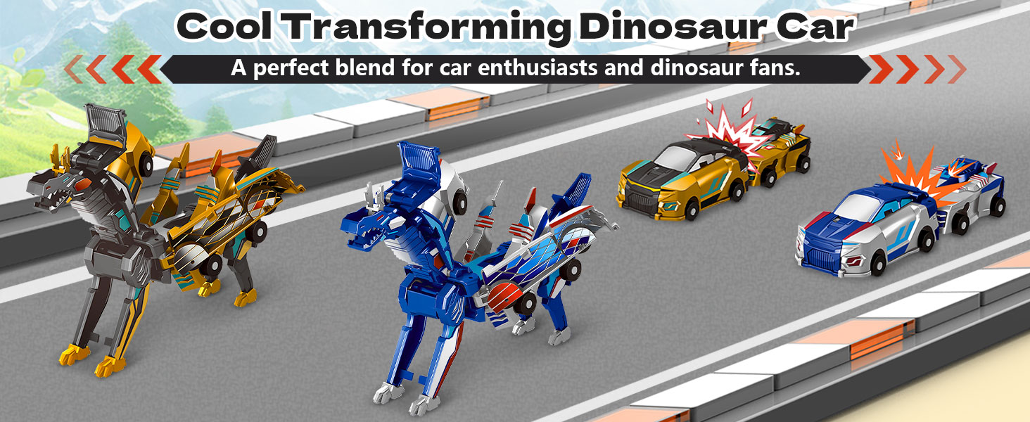 - 【2-in-1Transformation Dinosaur Car Toy】: This collision .Kids manually crash the two magnetic car toys together to trigger an amazing transformation into a dragon toy with wings—no batteries or remote needed. A fun 2-in-1 deformation robot toy set transforming dino car toy combines the excitement of racing with the raw power of dinosaurs that delights boys and girls. Perfect toy for ages 2-4, 3-5, and 5-7.
