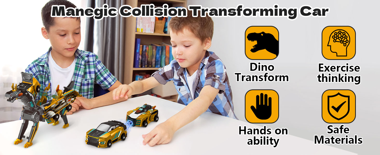 - 【2-in-1Transformation Dinosaur Car Toy】: This collision .Kids manually crash the two magnetic car toys together to trigger an amazing transformation into a dragon toy with wings—no batteries or remote needed. A fun 2-in-1 deformation robot kids toy toy set transforming dino car toy combines the excitement of racing with the raw power of dinosaurs . Perfect toy for ages 2-4, 3-5, 5-7 and 8-12.