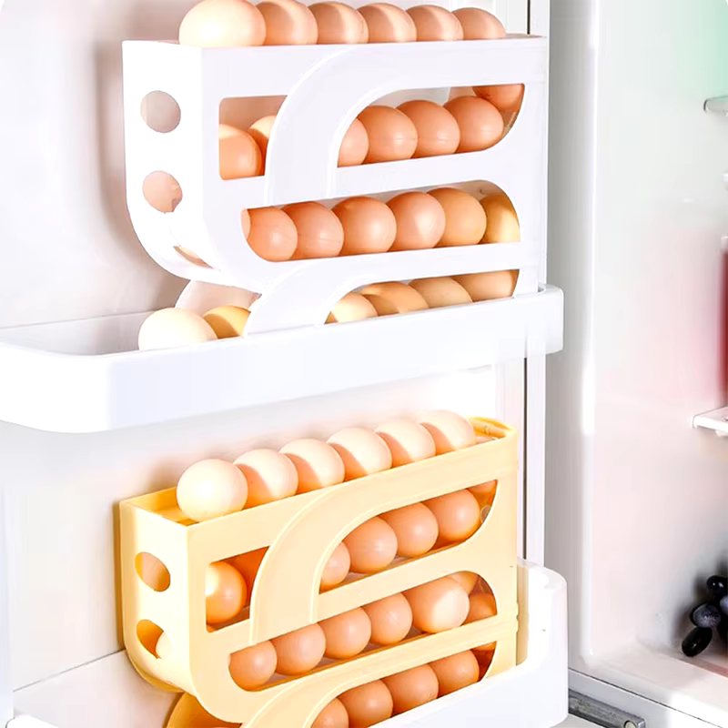 Make egg storage more efficient with the Automatic Roll-Out Egg Storage Device. Designed to hold up to 30 eggs, this high-quality egg box fits neatly in your refrigerator, ensuring your eggs stay fresh and organized. The roll-out design allows for easy access, automatically rolling the eggs forward for convenient use. Built with durable materials, this egg rack provides a space-saving solution for your kitchen, perfect for those who need extra organization in the fridge. Simplify your meal prep with this must-have egg storage device, ideal for households of all sizes.