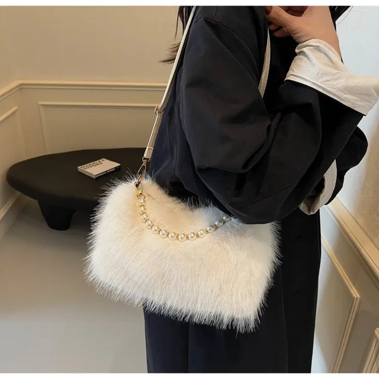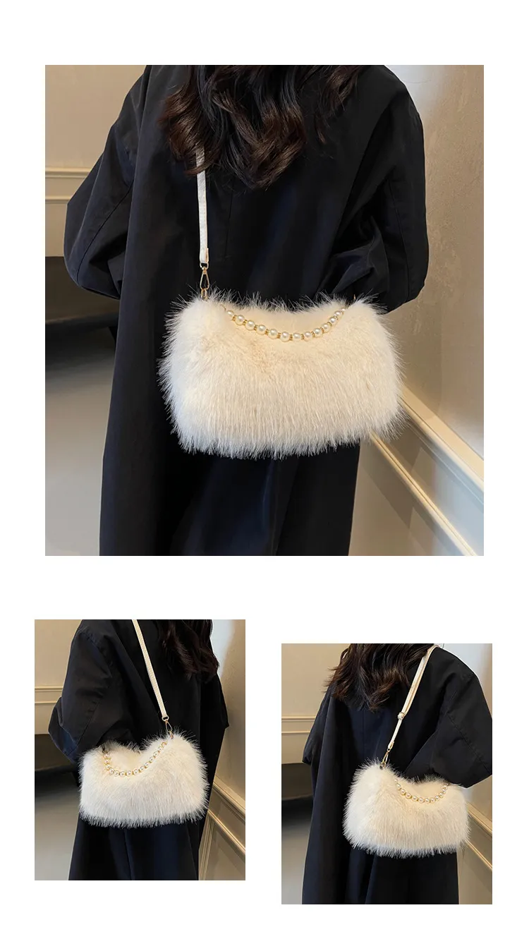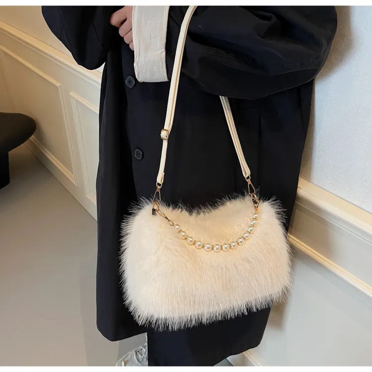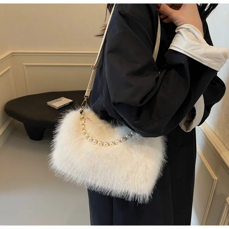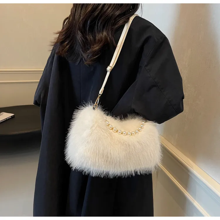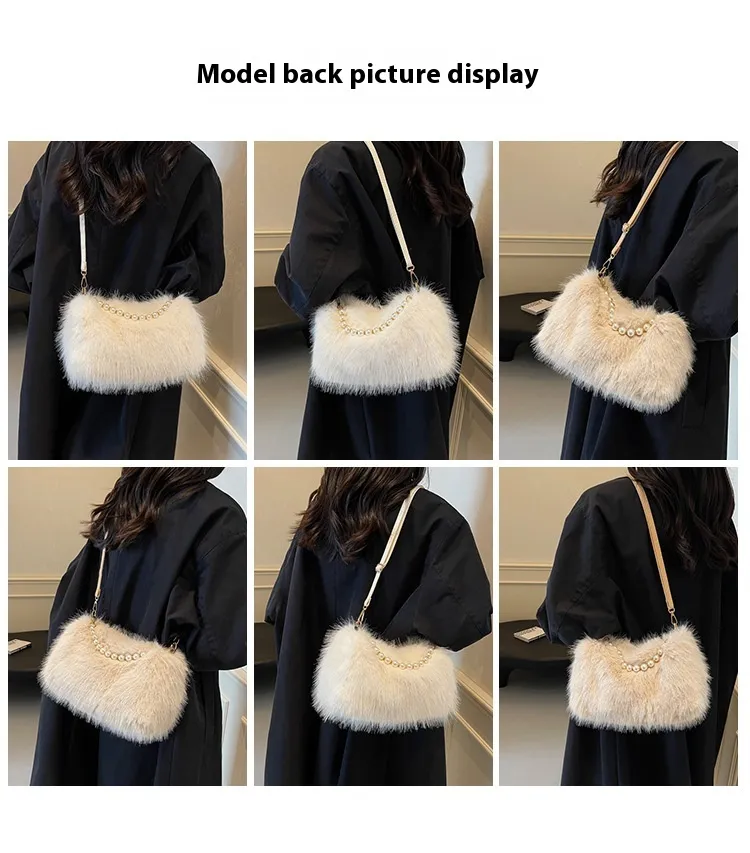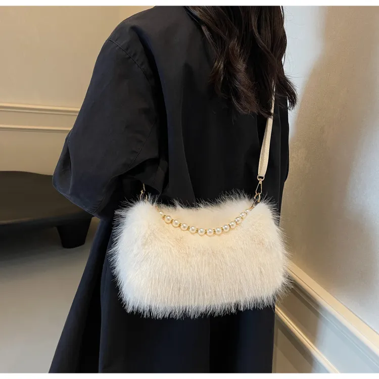 Description – Autumn And Winter Fashion Shoulder Bags Pearl Chain Crossbody Bag Versatile Commuting Armpit Plush Female Bag