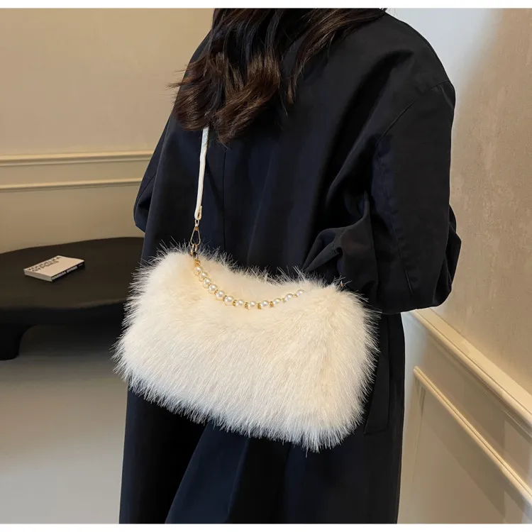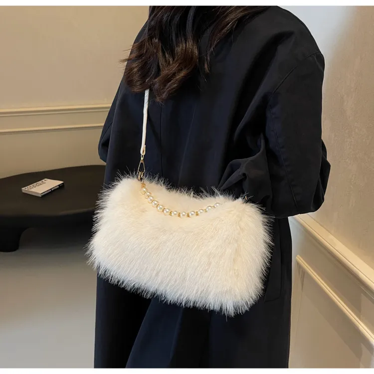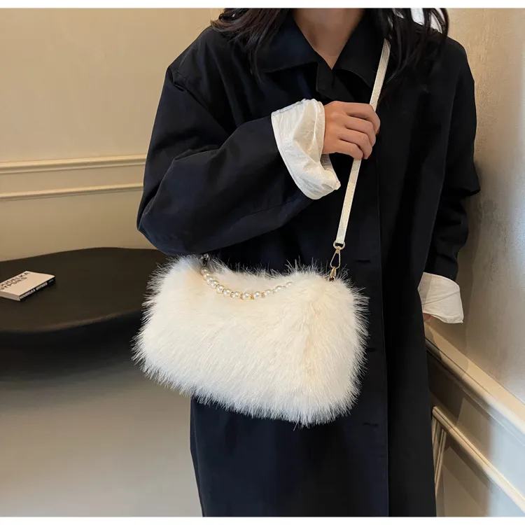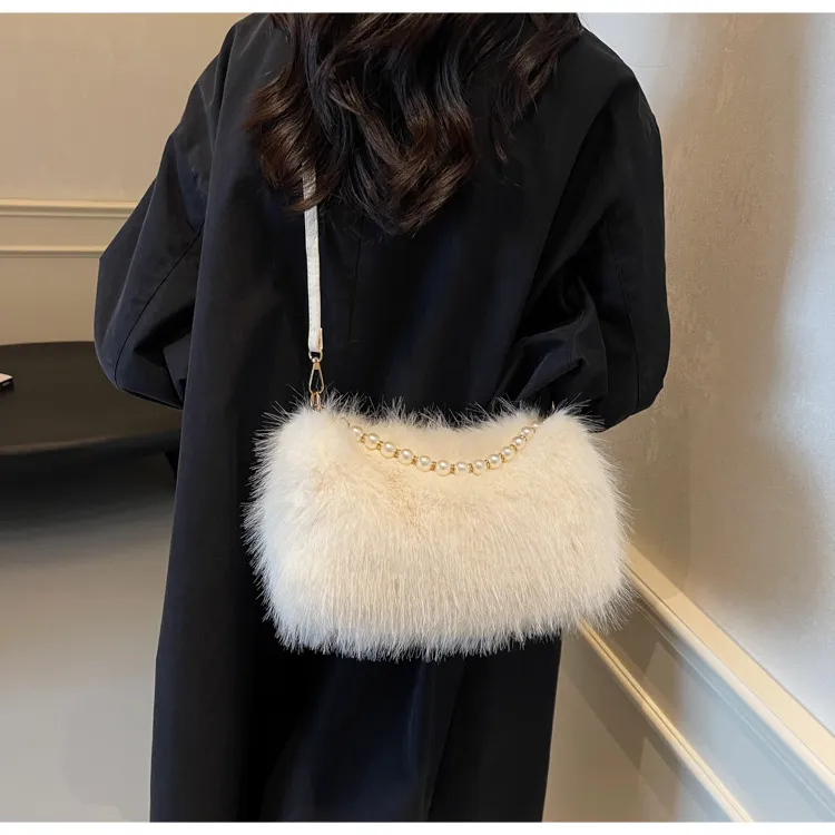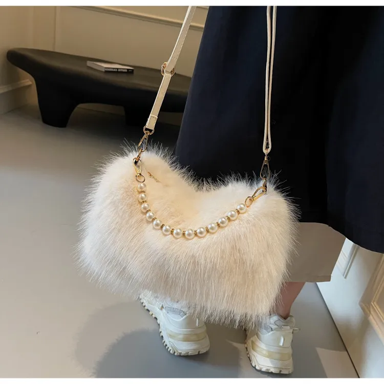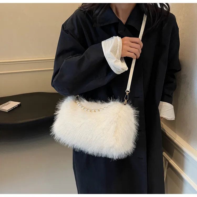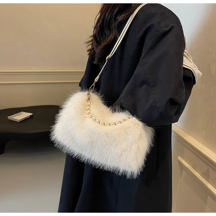 Description – Autumn And Winter Fashion Shoulder Bags Pearl Chain Crossbody Bag Versatile Commuting Armpit Plush Female Bag