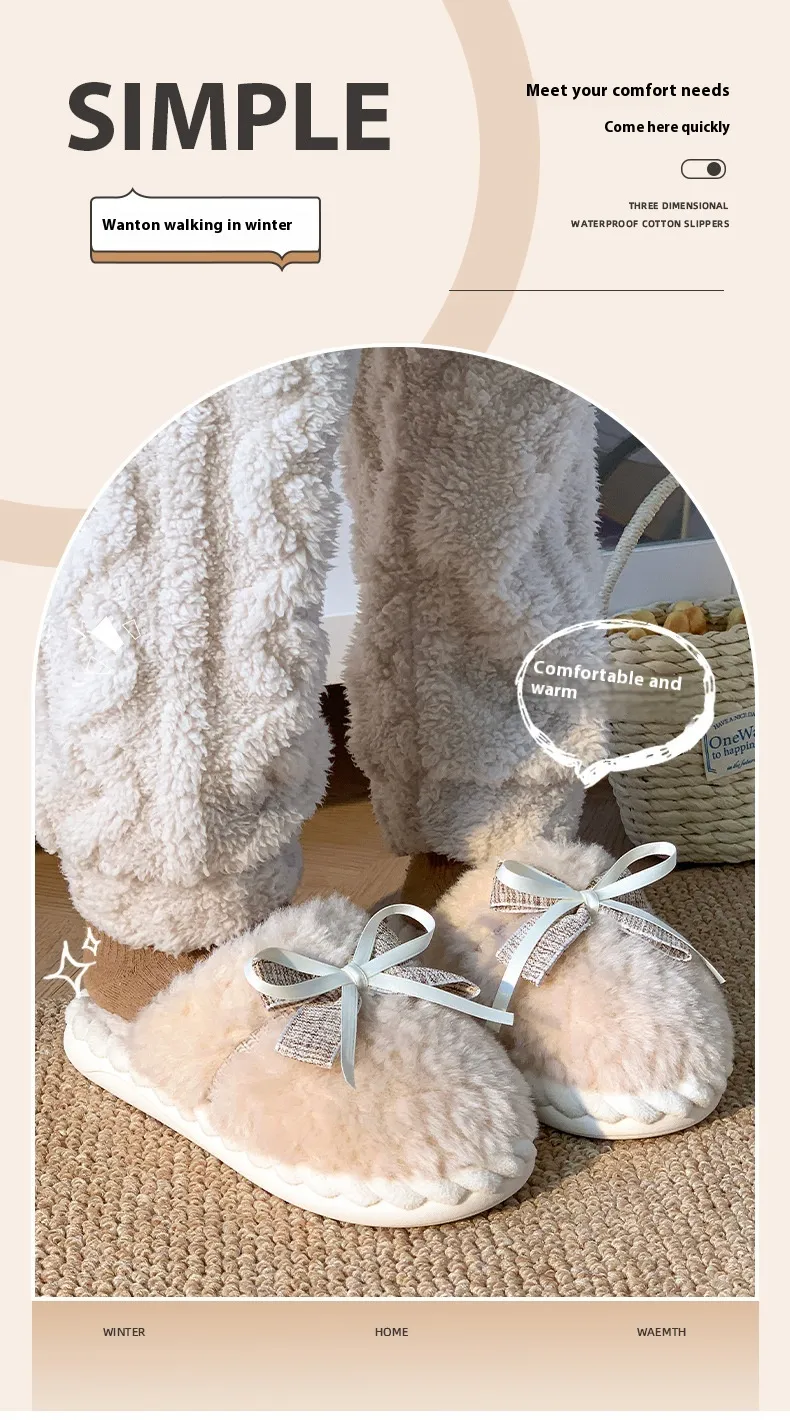 Autumn And Winter New Bow Tie Cotton Slippers Ladies Outside The Girl Heart Warm Plush Indoor Home Monthly Shoes Cotton Slippers