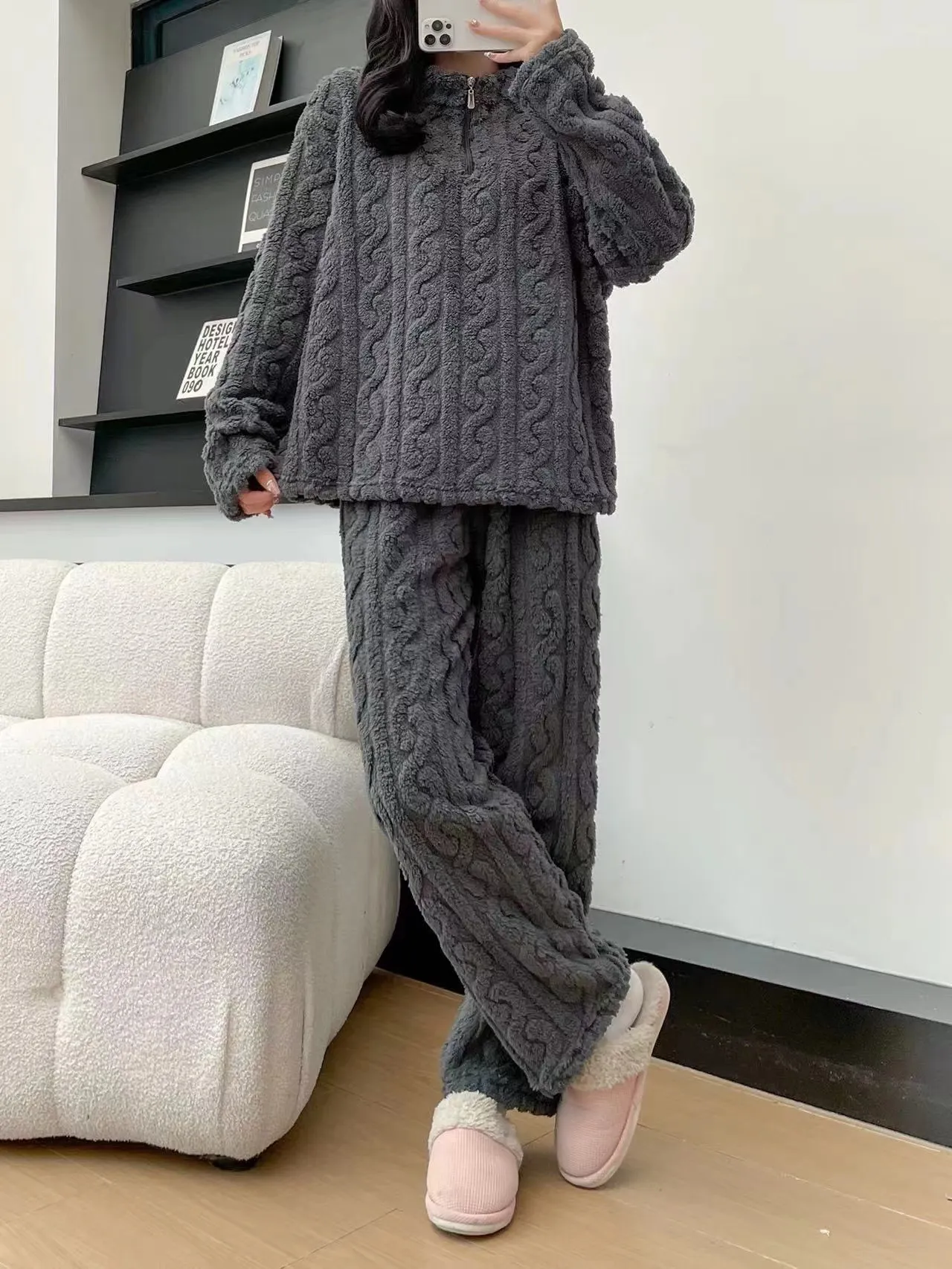 Autumn and Winter New Twist Zipper Couple Fleece-lined Thick Coral Fleece Pajamas