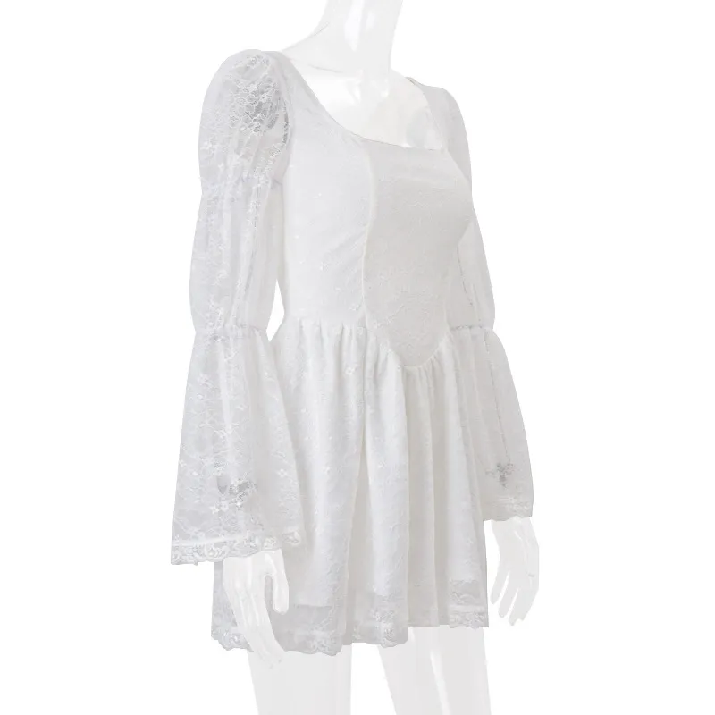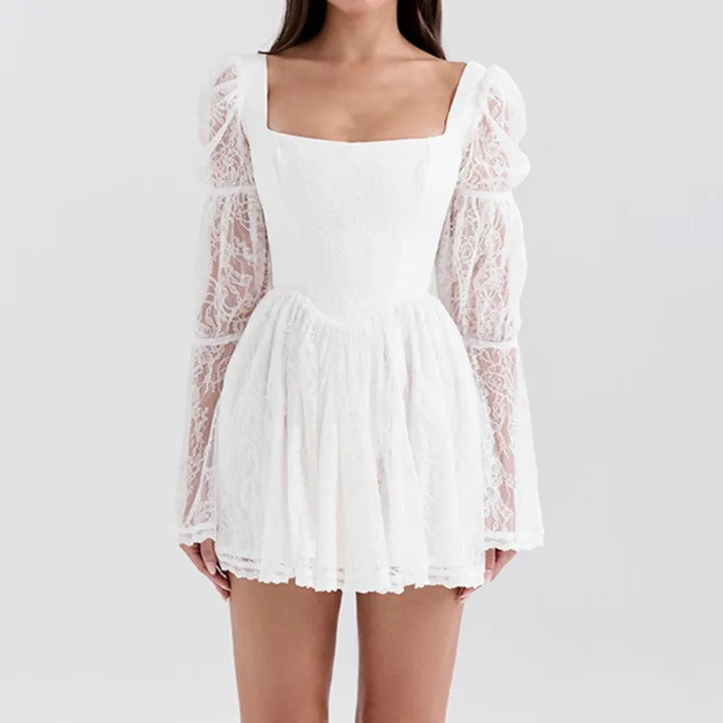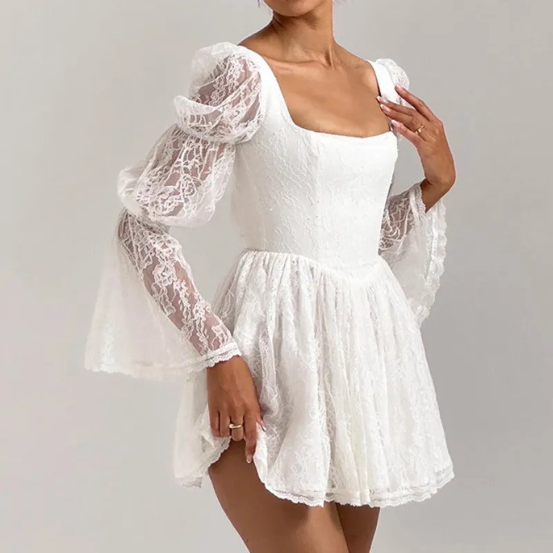 Autumn New Sexy Square-neck Long Sleeve Waist Lace Dress
