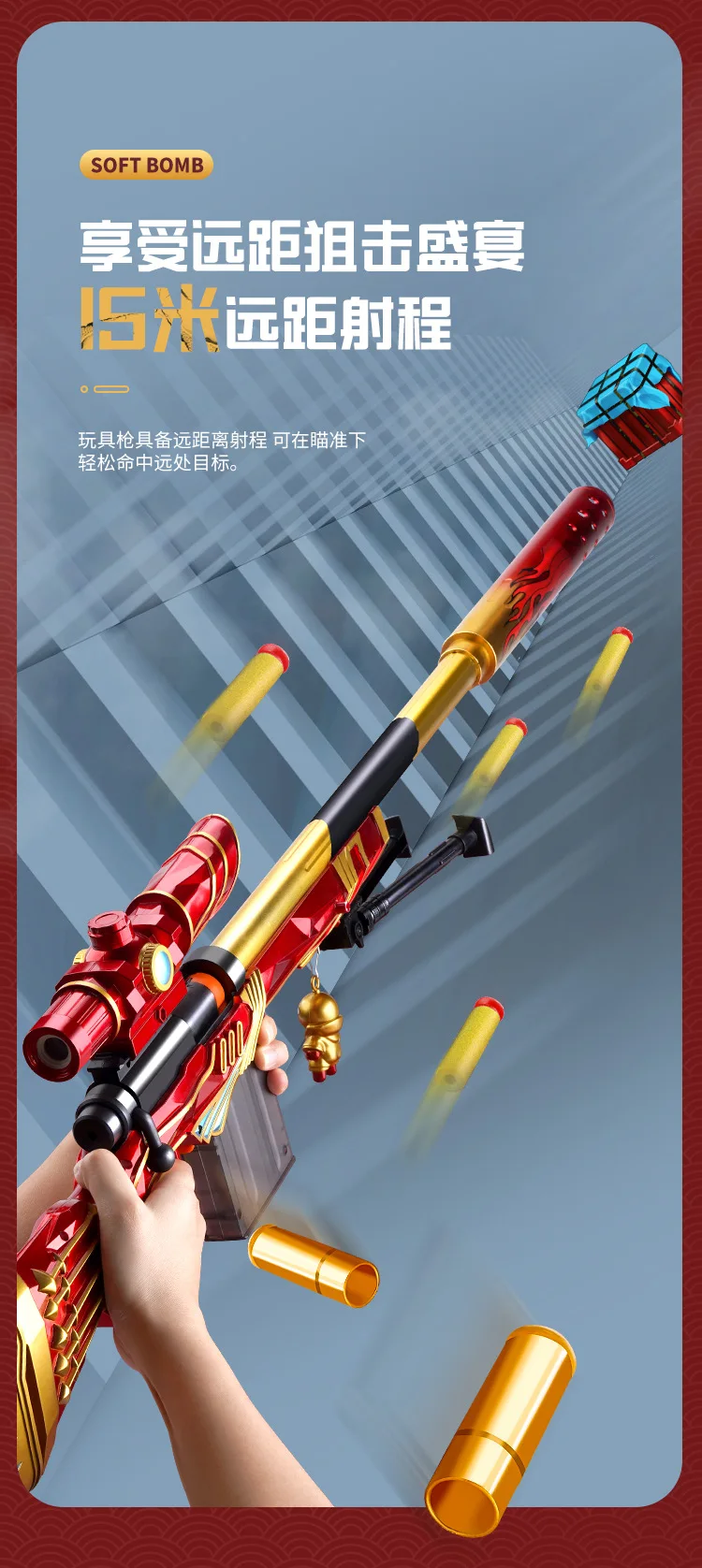 The design of this toy sniper rifle is inspired by the popular AWM 98k and M416 rifles, known for their powerful performance in various shooting games. This toy rifle is suitable for boys and children who enjoy outdoor activities and active play. Itโs a great way for kids to engage in physical activity while developing hand-eye coordination and motor skills.