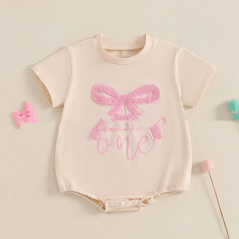The standout feature of this romper is the cute bow detail and towel embroidery. The bow adds a sweet, feminine touch to the romper, while the embroidered design gives it an extra layer of charm. The combination of these delicate details makes this romper the perfect piece for dressing up your little girl in a fun and fashionable way.