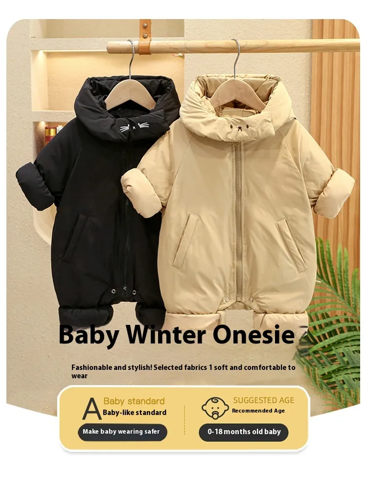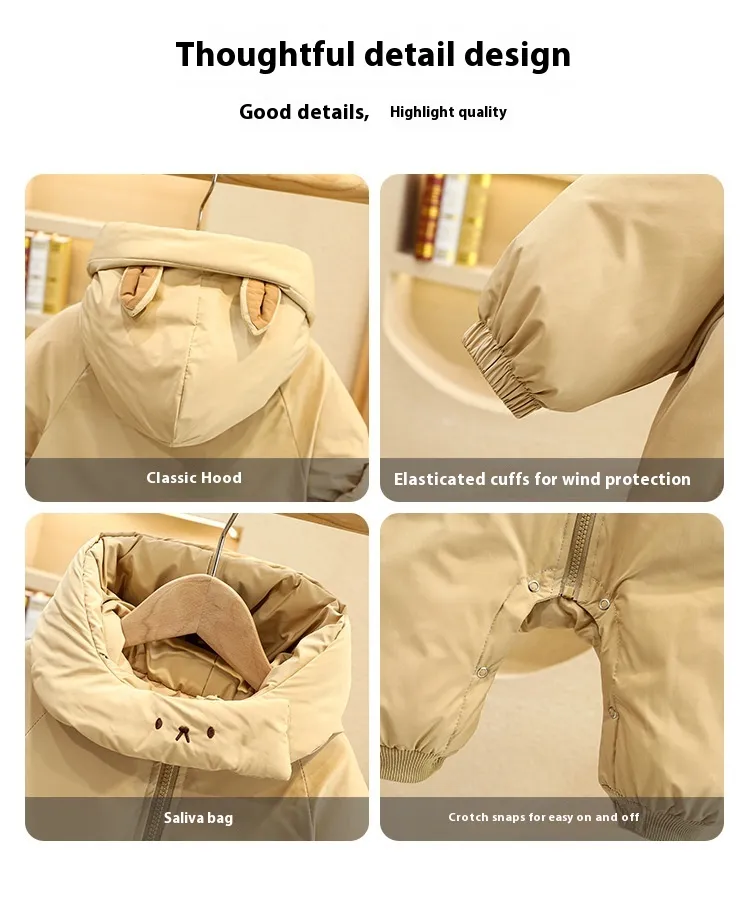 Easy‑use snap buttons, zippers, and elastic cuffs make dressing and diaper changes simple while maintaining warmth.