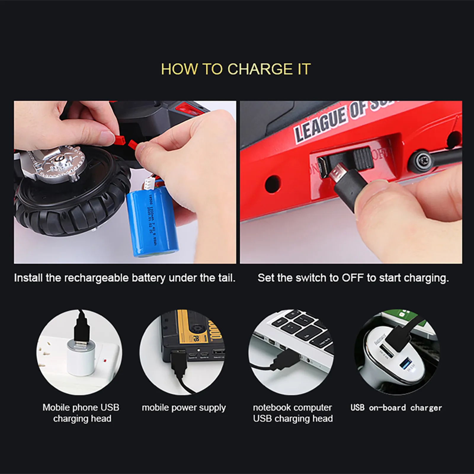 Remote control battery: AAA 1.5V*2 (not included) motorcycle*1, remote control*1, USB charging cable*1, screwdriver*1, manual*1