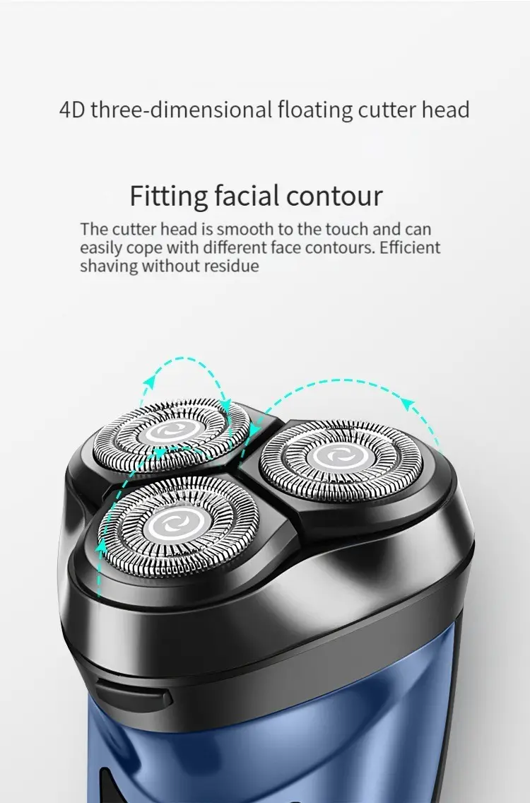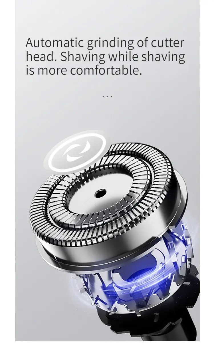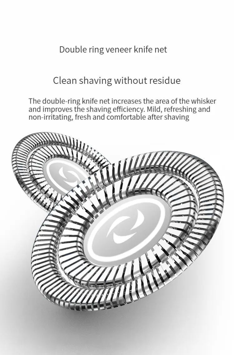 Features: 1. Strong fit: 4D three-dimensional floating blade that fits the contours of the face. 2. Good shaving effect: Double ring veneer knife net, clean shaving without residue. 3. Strong comfort: Shaving while grinding makes shaving more comfortable. 4. Convenient to use: USB charging, can be used while charging. 5. Strong battery life: 1.5 hours of charging, with strong battery life. Two minutes of daily use can last for 30 days.