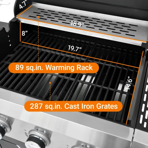 - Abundant Cooking Space: 287 square inches cooking area at a total comprises 376 sq. in. stainless steel cooking grates and 89 sq. in. chrome-plated steel wire warming rack, which fits for cooking 20 hamburgers at the same time.