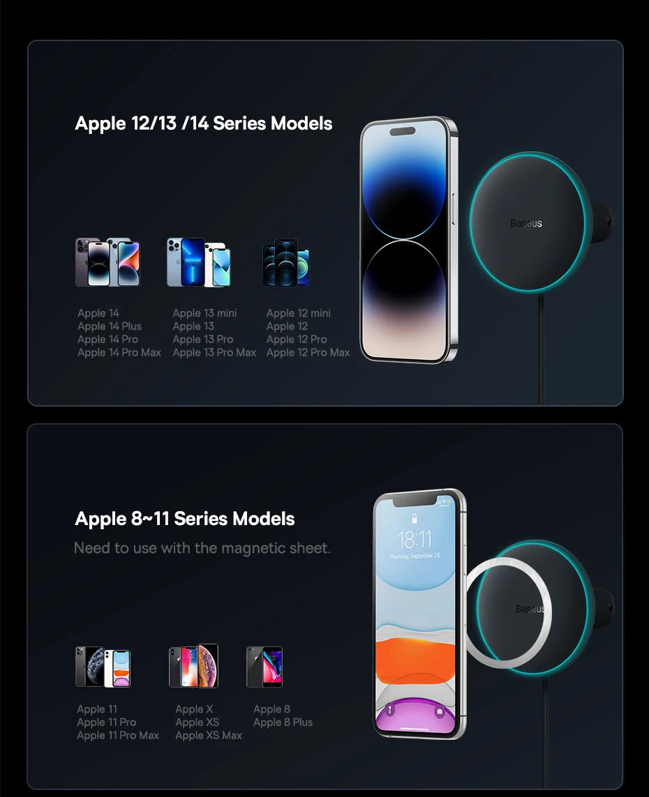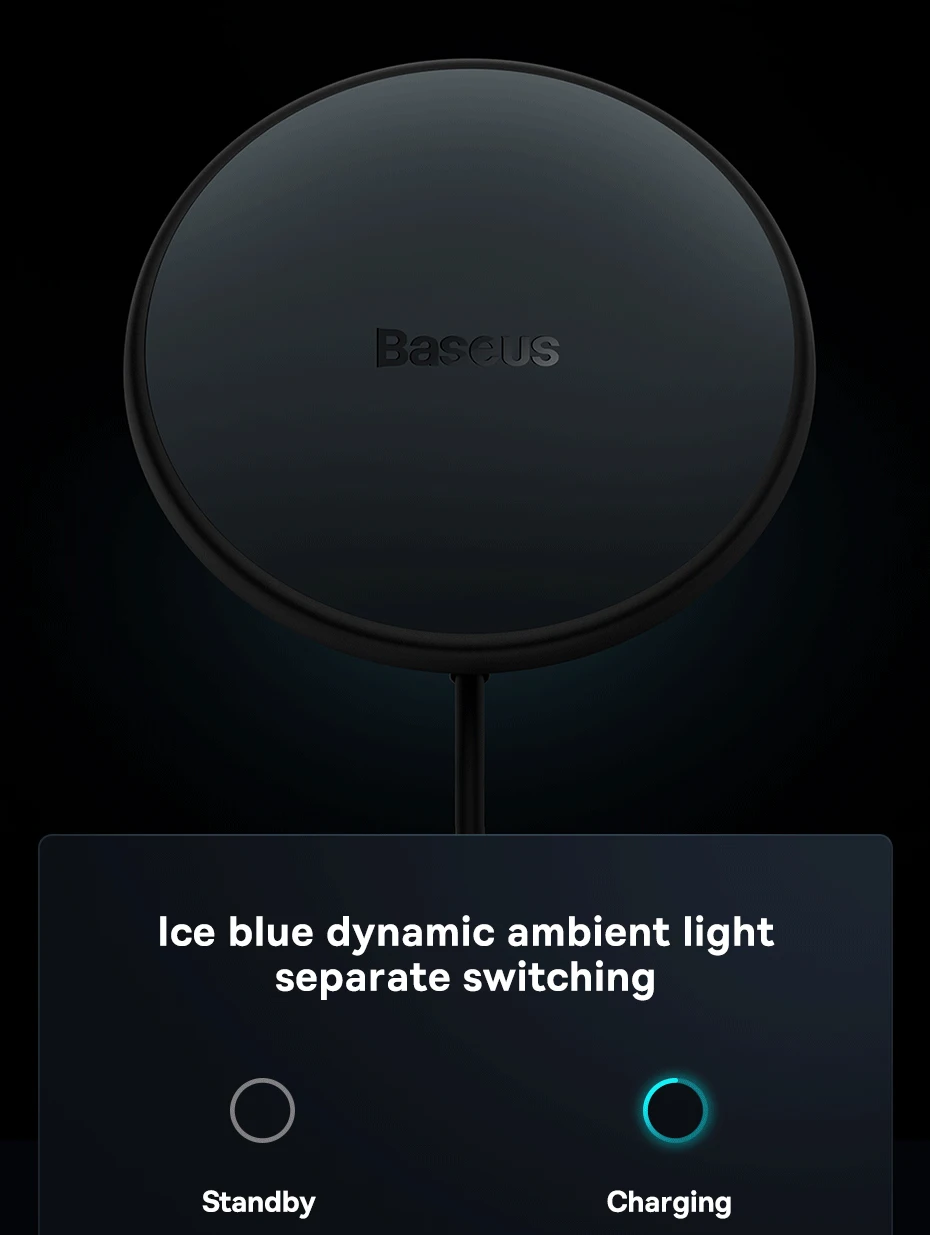 Appearance The Baseus Car Phone Holder Magnetic Wireless Charger features a sleek and modern design with a durable build. The holder is equipped with strong magnets that securely hold your iPhone in place, while the elegant finish complements any car interior. Its compact size ensures it doesn't obstruct your view, providing both functionality and style.