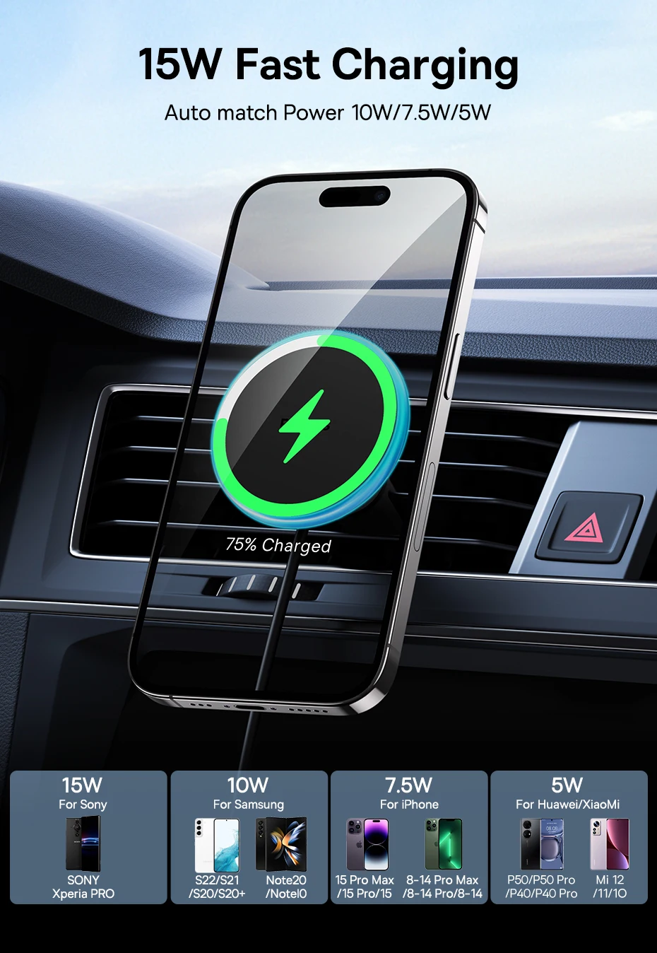 Functionality This car phone holder is not just a mount but also a powerful wireless charger. It supports 15W fast charging, ensuring your iPhone 15, 14, or 13 Pro Max is charged quickly and efficiently while you're on the road. The magnetic alignment ensures your phone stays in place, even on bumpy rides, and allows for easy one-handed operation.