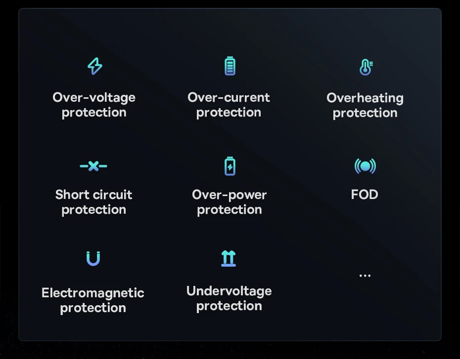 - Foreign Object Detection: Automatically stops charging if a foreign object is detected.