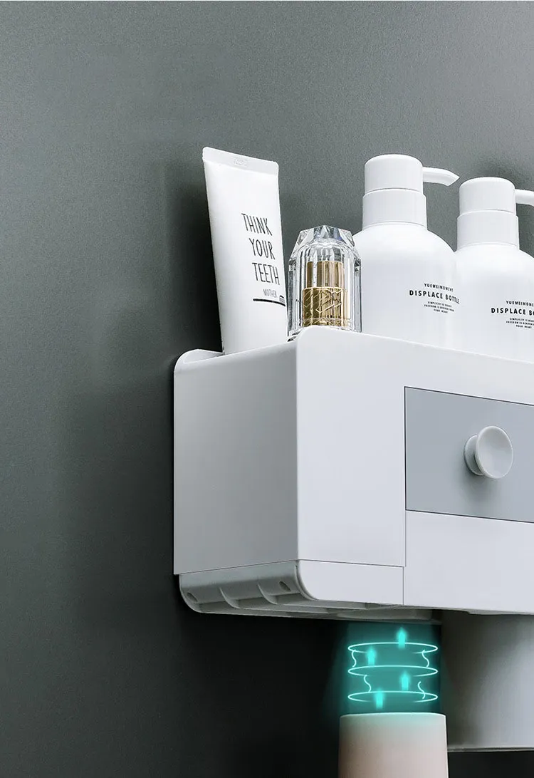 toothbrush organizer, bathroom organizer, space-saving bathroom accessory, toothpaste dispenser for family, automatic toothpaste squeezer,