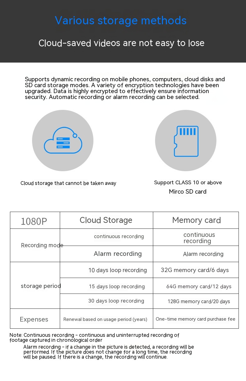 Secure Storage: Choose between local storage using a microSD card or cloud storage for your recorded footage. Both options provide secure and reliable ways to store your video recordings.