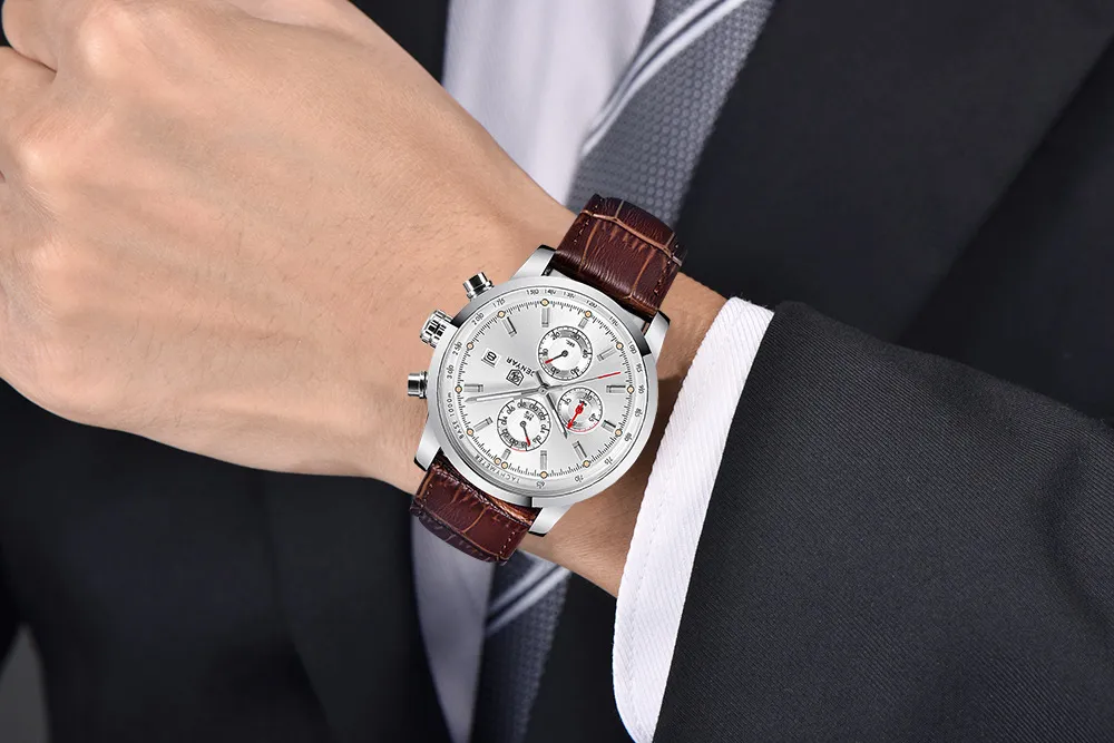 Bold and Stylish Design: The three sub-dials and sleek leather strap create a sporty yet elegant design that complements