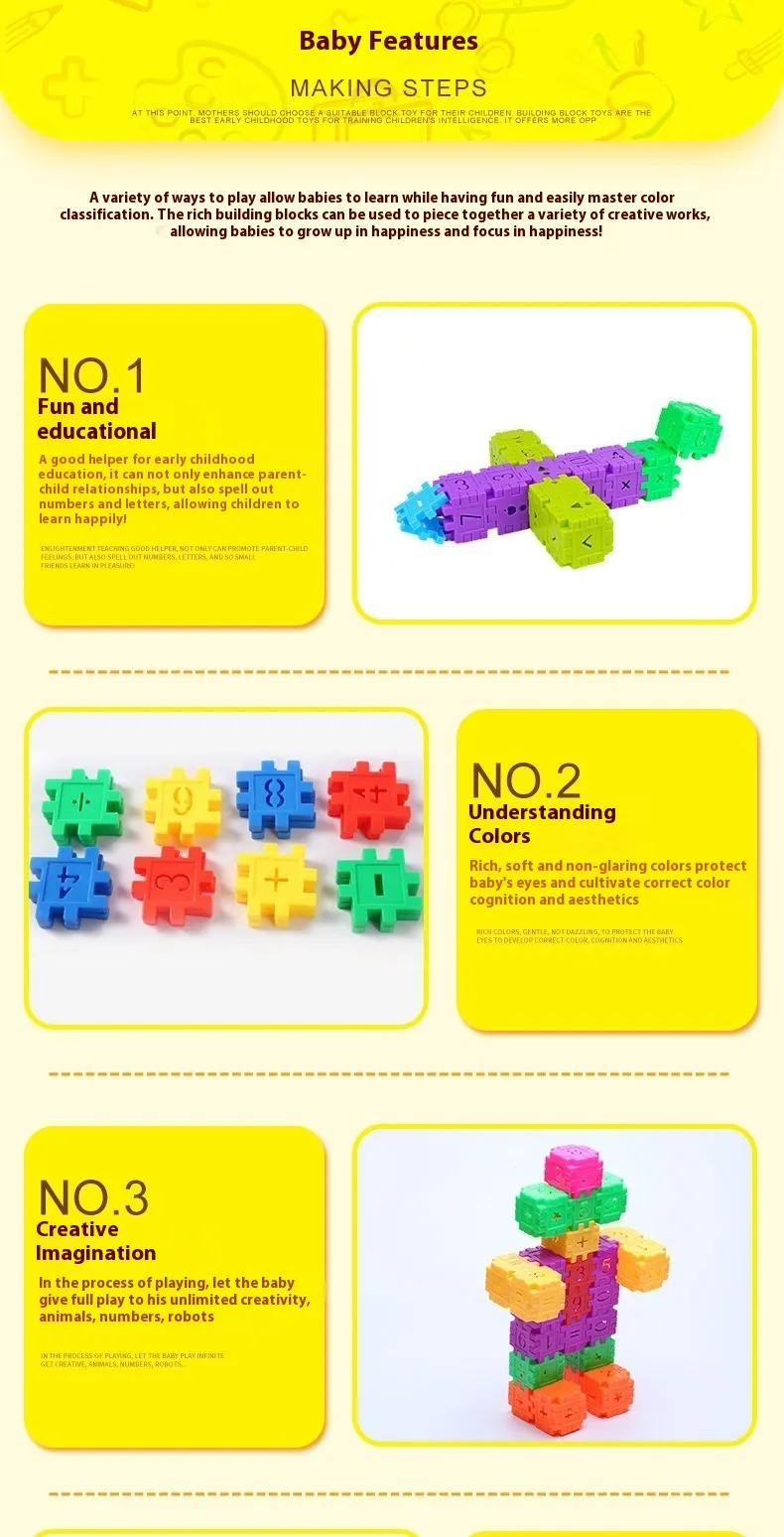 - Educational Value: Blocks often feature numbers, letters, and shapes, aiding early learning.