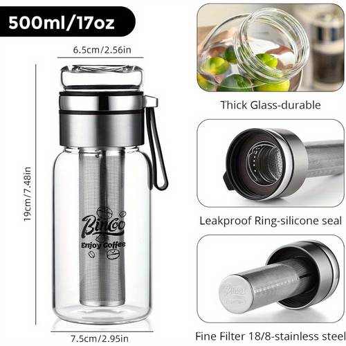 The Bincoo Glass Cold Brew Coffee Maker is designed to provide you with a fresh and delicious cold brew coffee wherever you go. Featuring a thick borosilicate glass body, this coffee maker is both durable and resistant to temperature changes. The extended fine mesh filter ensures that your coffee or tea is brewed to perfection, allowing for smooth, rich flavors without any unwanted grounds. Whether you're making iced coffee for a workout, a hike, or simply for enjoying at home, this multipurpose bottle offers the perfect way to brew and store your favorite beverages.