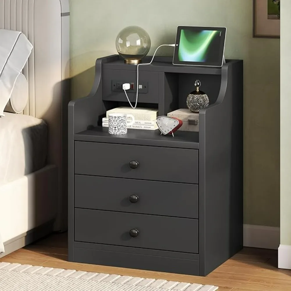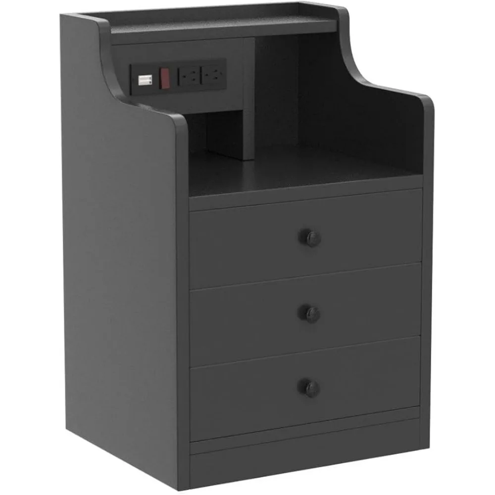 Black Nightstand with Charging Station - 3 Drawers Wood Sofa End Side Table with USB Ports and Outlet