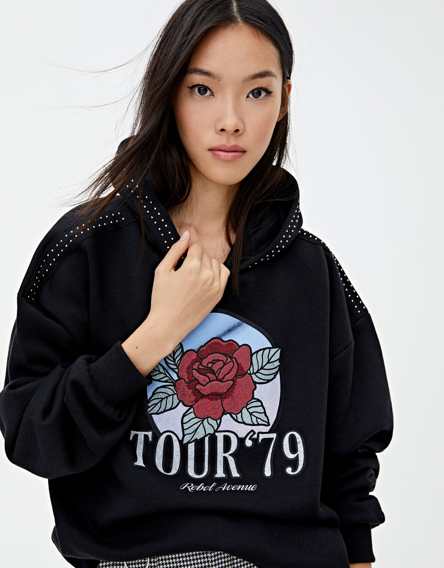 Bold Rose Embroidery: Features intricate rose designs, adding a unique and feminine touch to the classic black sweatshirt.