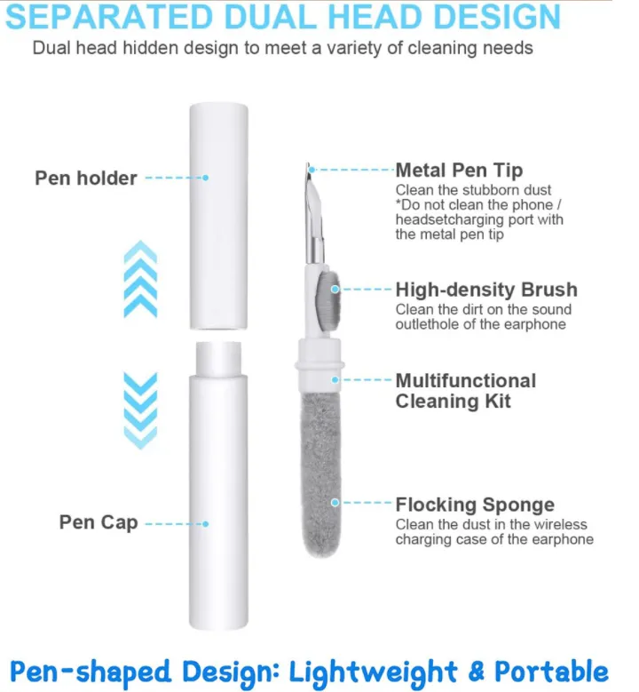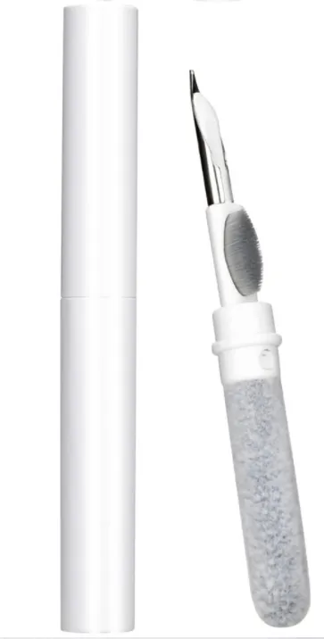 The cleaning pen features two cleaning heads: a soft brush for removing dust and dirt, and a precision tip for cleaning tight spaces, such as speaker grills and charging ports. This ensures a thorough cleaning of every part of your earbuds.