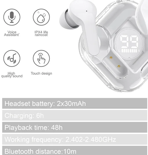 Experience premium sound quality and cutting-edge design with the Bluetooth Wireless Headset TWS Noise Reduction Transparent. Perfectly crafted for music lovers, professionals, and those who appreciate comfort and high-end audio, this sleek, transparent wireless headset offers noise reduction technology, ensuring crystal-clear audio during calls, music, or gaming. Featuring True Wireless Stereo (TWS) technology, this headset provides superior sound with full mobility and convenience, allowing you to enjoy your favorite tunes or take calls without the hassle of tangled wires. The transparent design adds a modern, stylish touch, making it as fashionable as it is functional.