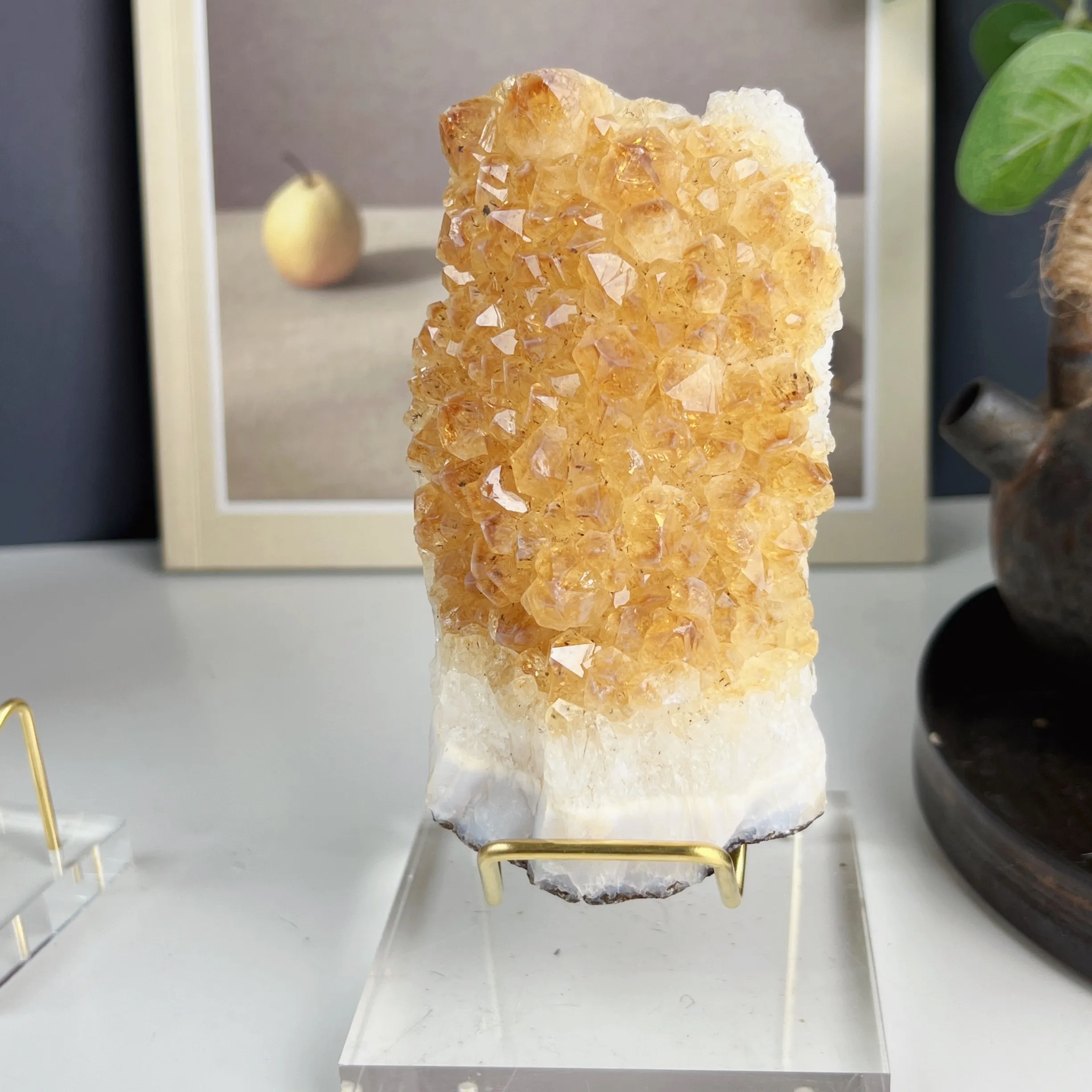 The Brazilian Citrine Cluster with Delicate Pedestal is a stunning and unique decorative piece, perfect for those looking to enhance their