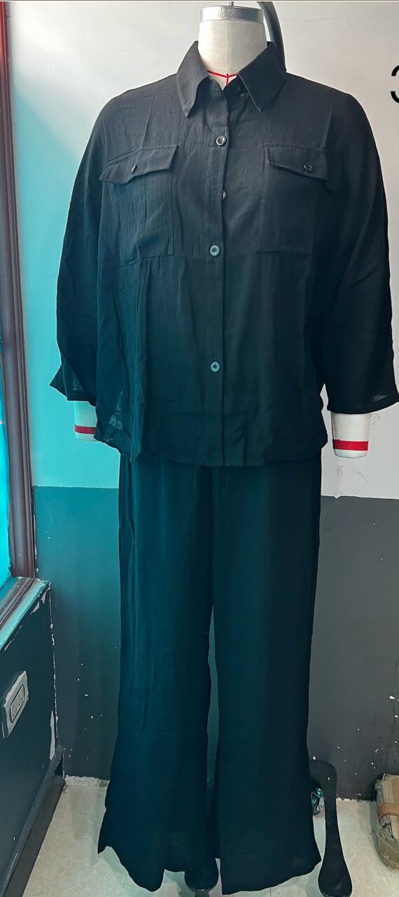 The suit features a loose-fitting, long-sleeve shirt that drapes gracefully over the body, providing a flattering fit for all body types. Its elegant button-down front and crisp collar add a touch of classic charm, while the adjustable cuffs allow for versatile styling options. The shirt's longer length makes it ideal for pairing with both pants and skirts, offering endless outfit possibilities.