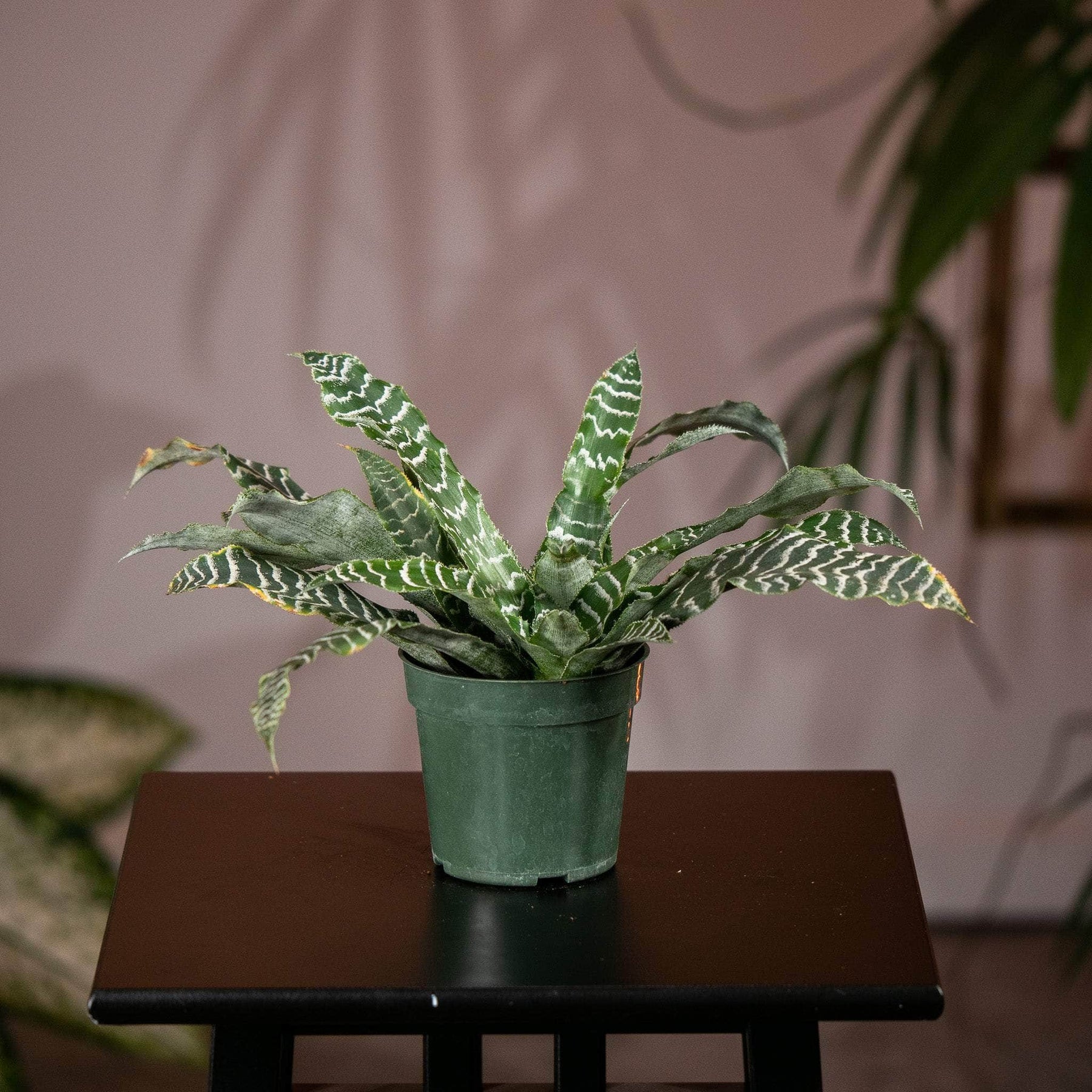This compact Bromeliad thrives on minimal care and is perfect for adding a splash of color to small spaces such as desktops, shelves, or windowsills. Its unique, low-growing form makes it an ideal choice for terrariums or as an accent plant in mixed arrangements.