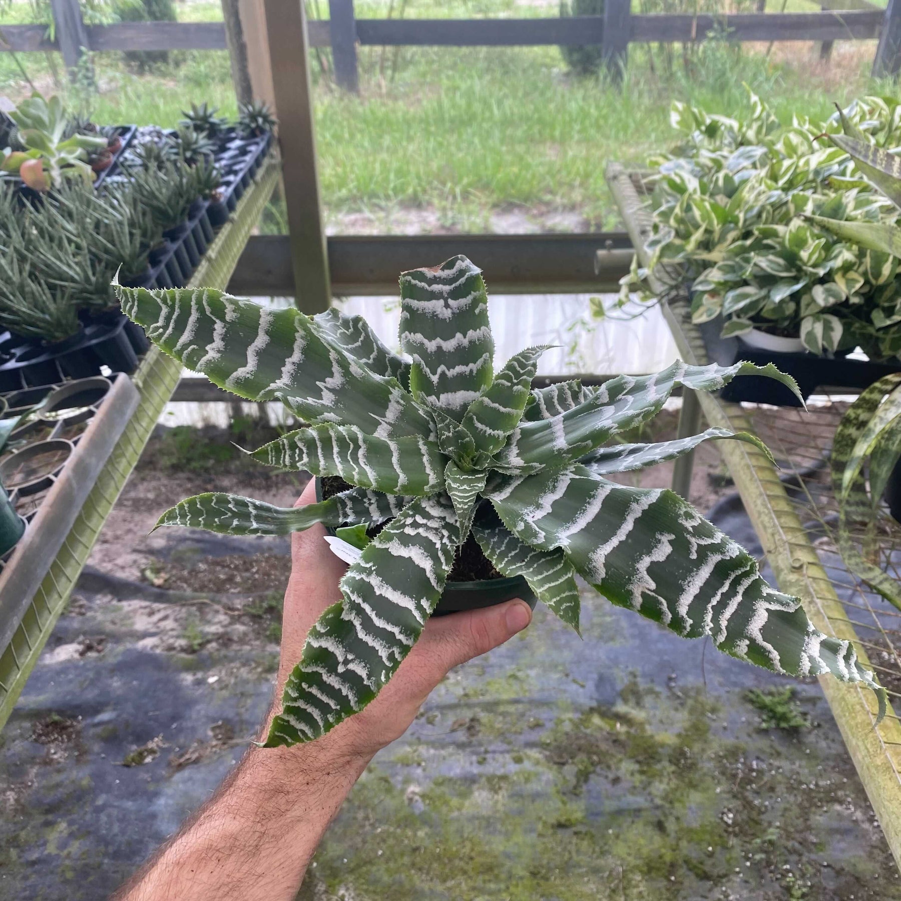 Cryptanthus 'Betty', commonly known as Earth Star, features vibrant, star-shaped rosettes of leaves that are beautifully variegated with shades of dark green and silvery-white stripes. The leaves are wavy and serrated, giving the plant a dynamic and textured appearance. Each leaf's intricate pattern and coloration make 'Betty' a living piece of art, captivating and delightful in any setting.