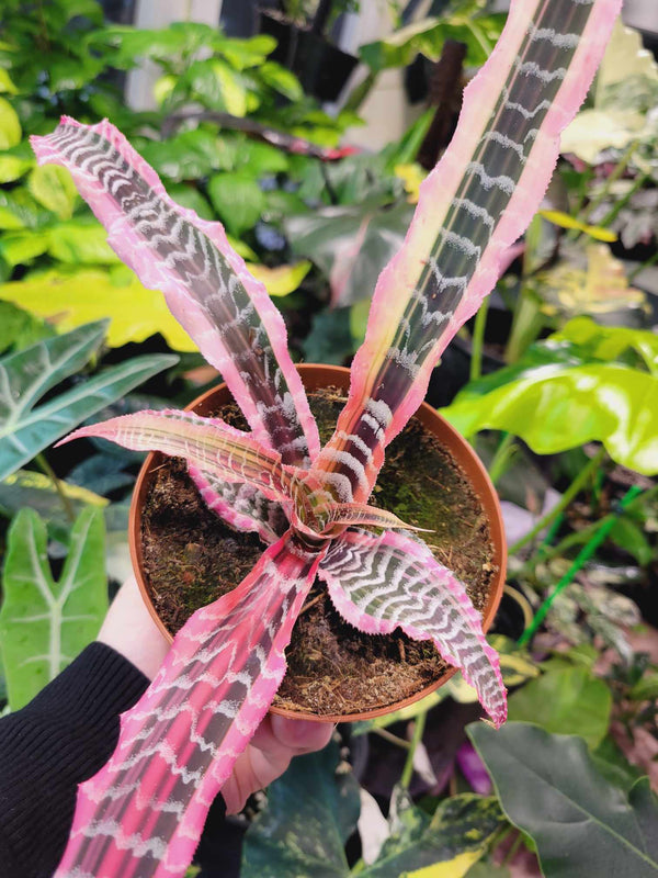 Cryptanthus 'Elaine' is celebrated for its rosette of strappy, textured leaves that exhibit a remarkable blend of deep red and pink hues, accentuated by contrasting zebra-like white stripes. Each leaf is slightly wavy, adding a dynamic and three-dimensional quality to the plant. The rosette itself is relatively compact, typically reaching about 15-20 cm (6-8 inches) in diameter, making it an ideal choice for small spaces or as a focal point in a larger plant arrangement.